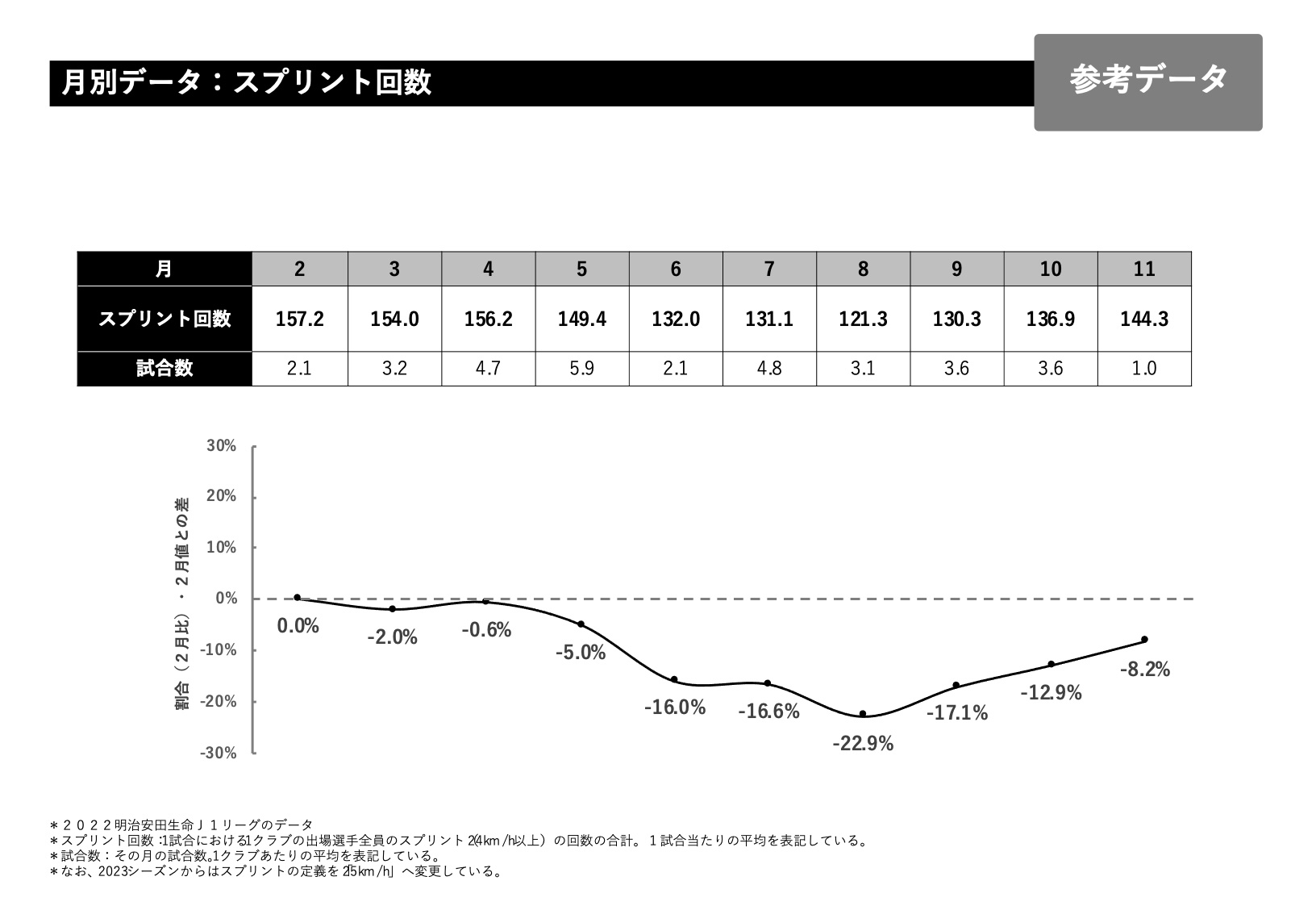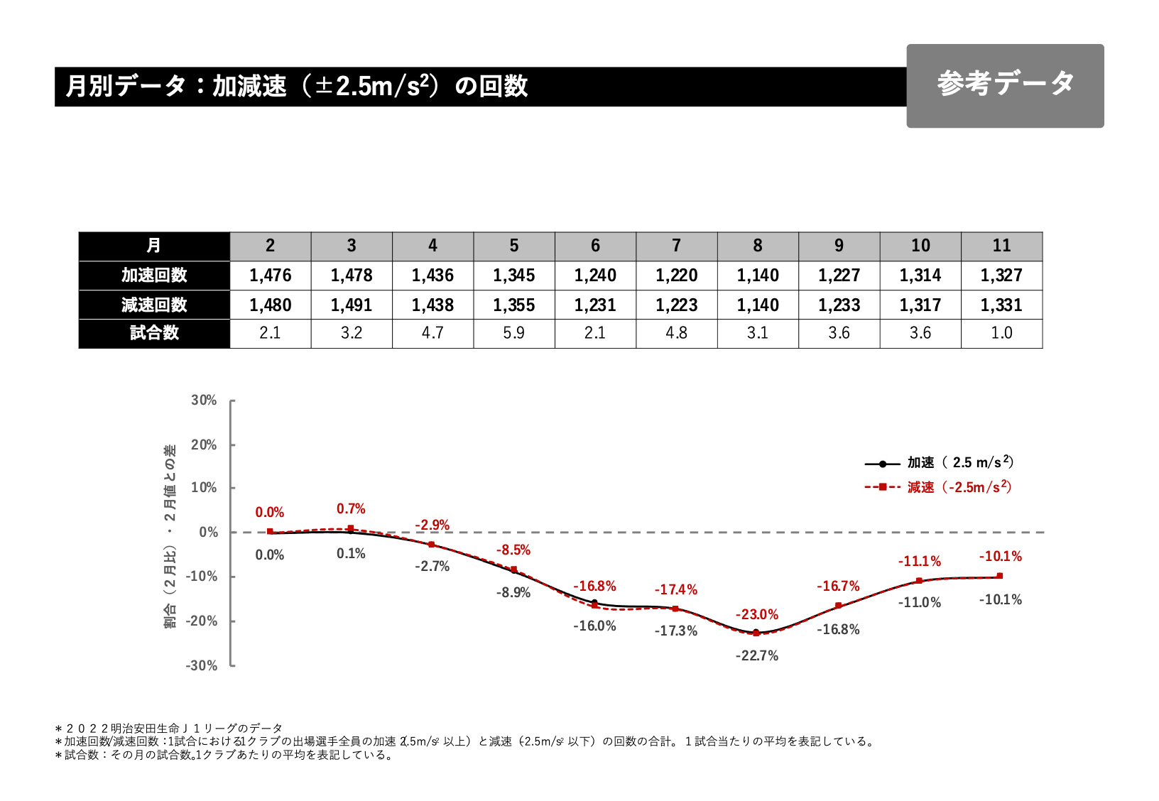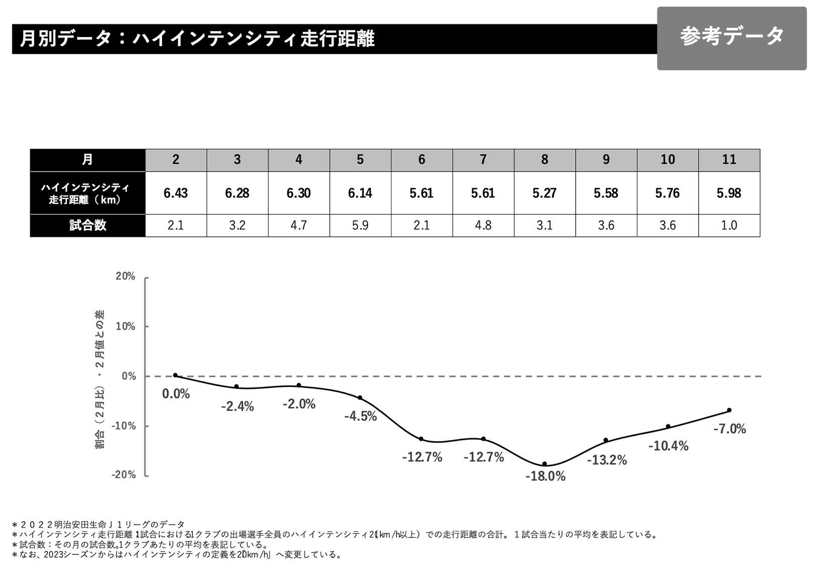 総走行距離で言いますと大体1試合、1クラブあたり111キロが2月の平均になるのですが、これを0とした時に増えているのか減っているのか割合を月別に示しているのが下のグラフになっています。総走行距離で言いますと、6月くらいから少し下がってきて6、7、8、9と10月あたりも少し下がり11月に向けて少し上っていくデータになっています。