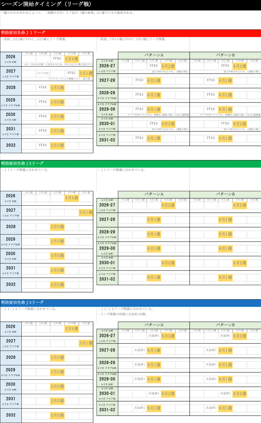 J1、J2、J3と上から並べていまして、左側のブルーがシーズン移行しない場合の2026シーズンから2032シーズンまで。緑の方が2026―27シーズンから2031―32シーズンまでのパターンA(ウィンターブレークが短いもの)、パターンB(ウィンターブレークが長いもの)のそれぞれのカレンダーを示しています。例えばシーズン開始のタイミングでいいますと、シーズン移行しない場合は基本的には2月の3週ぐらい、その1週間前にFUJIFILMSUPERCUPを実施しているという状況になっています。これが移行すると、大体8月の1週目もしくは2週目ぐらいにリーグ戦が開幕することを示しています。以下、J1,J2、J3とそれぞれ別で記載をしている状態です。