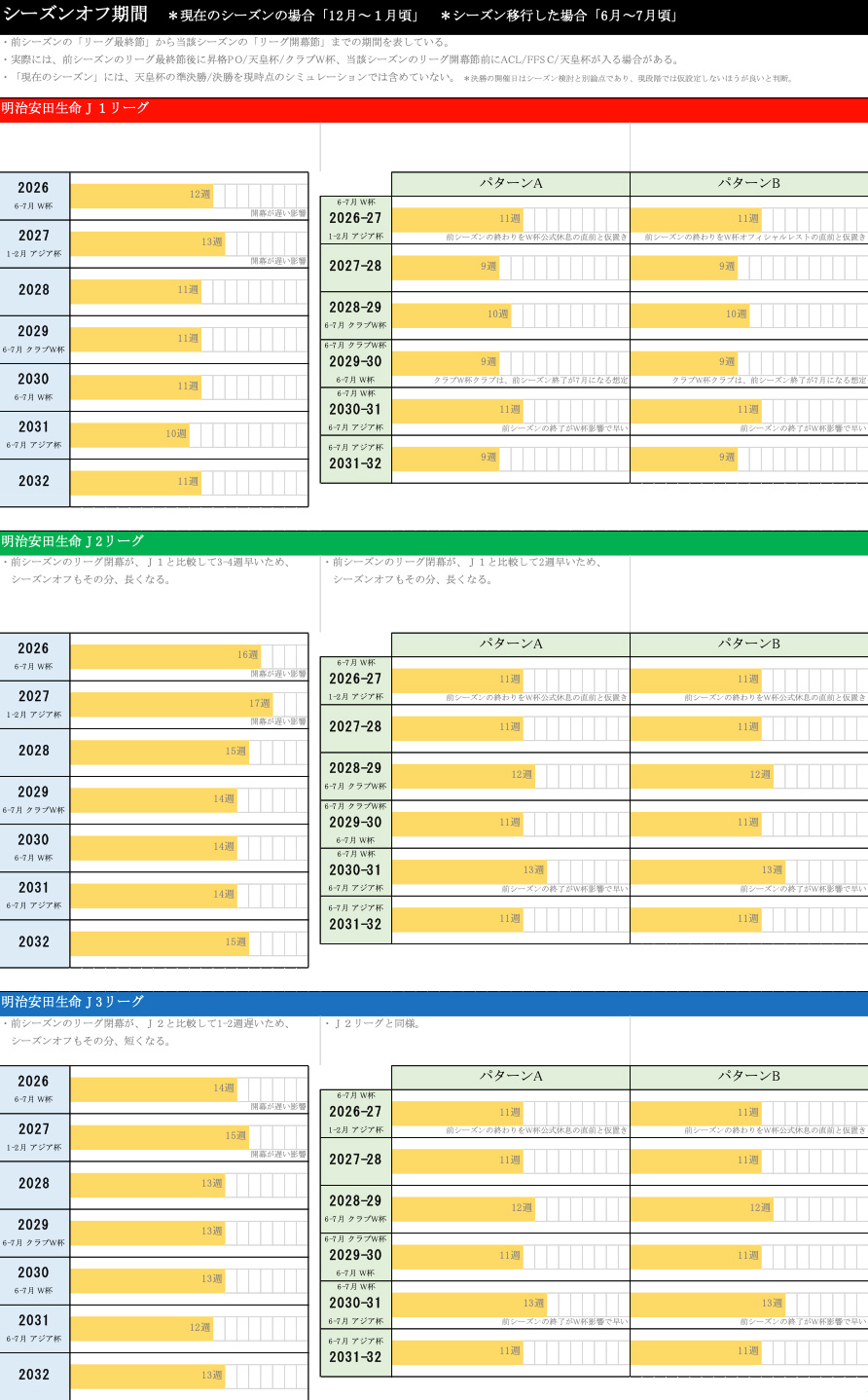 なぜここまでやっているかというと、移行する場合の最速は2026―27に設定しているので、2026―27シーズンから開始にしています。移行した場合、6月-7月ぐらいに国際大会でシーズンの前後を挟まれることになります。例えば前にワールドカップがあって、後ろにアジアカップがあるとか、前にワールドカップがあって、後ろに何もない、前にクラブワールドカップがあって、後ろにワールドカップあるなど、挟まれる状況が6種類あり、6年分で1サイクルになっています。従って、6年間によって、始まる週が少し変わったり、終わる週が少し変わったりしますので、これらの影響をしっかりと検証するために、1サイクル、6シーズン分のシミュレーションを行っています。それに合わせて、シーズン移行しない場合についても、同様に2026シーズンから2032シーズンまでをシミュレーションしているという状況です。