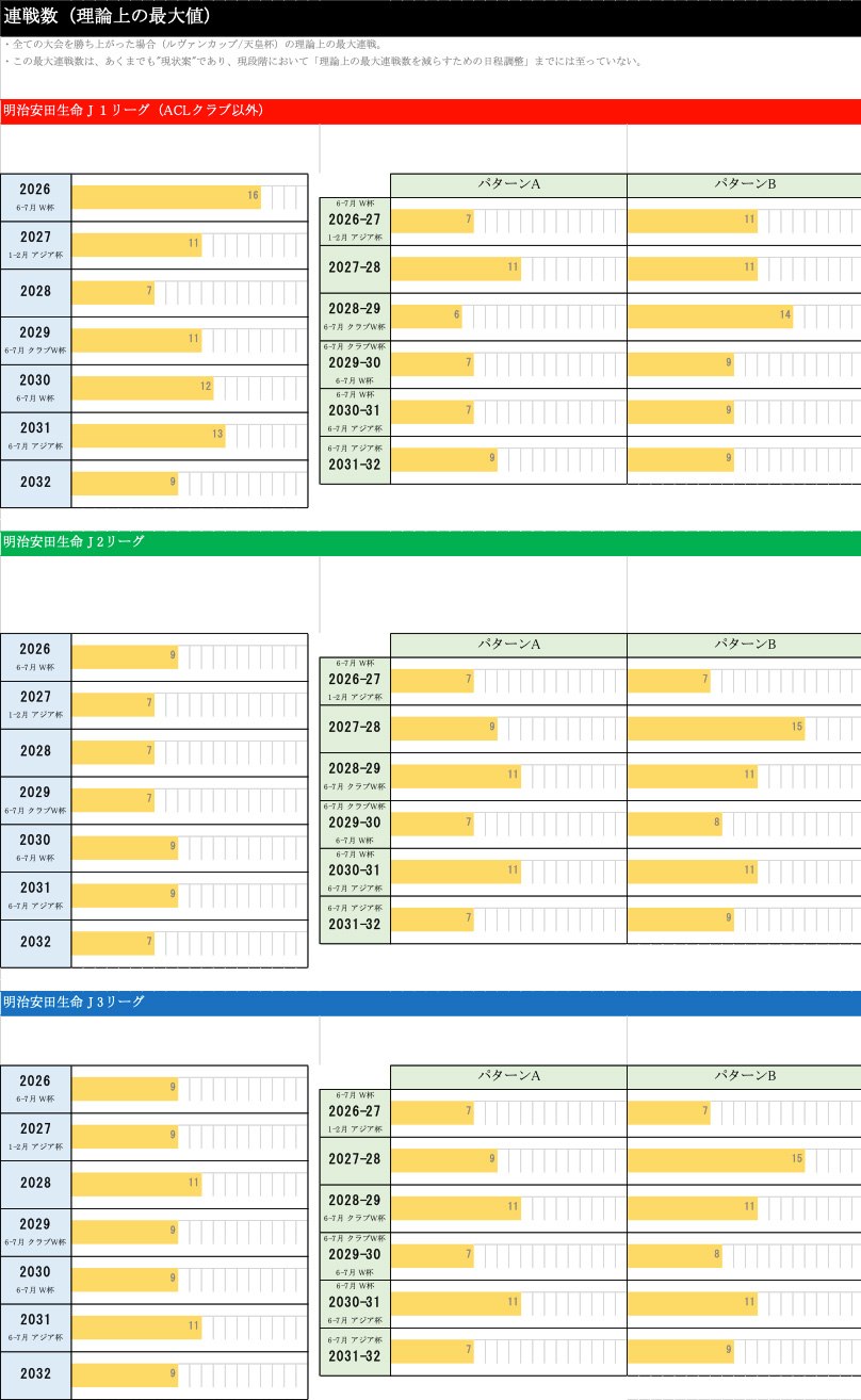 各クラブは、最大連戦だけではなく、どれくらいの連戦がどのくらいの回数で発生するか確認できる状況にはなっています。ただし、それをわかりやすく皆様に示す方法が無く、現状ではわかりやすいものだけ示している状況です。