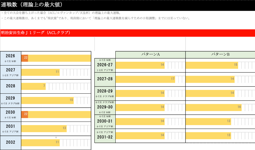 理論上の最大値のほうですが、まずJ1のACLに参加しないクラブの連戦数を記載しています。こちらもあくまでも理論上の最大値となっていますので、ご参考程度にご覧いただければと思います。ACLクラブの場合、移行しない場合8年に3回のサイクル、特にワールドカップイヤーなどは非常に多くの連戦がすべての大会に勝ち上がって決勝までいくと、あり得るという状況です。