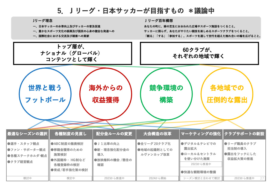 このような現状認識の中、今、Jリーグとしてどのような戦略で何を目指していくのかといった整理を進めているところです。こちらもまだ議論中で、固まっていないものなのですが、ぜひメディアの皆さまから多くのご意見をいただきたいと思い、公開させていただきます。