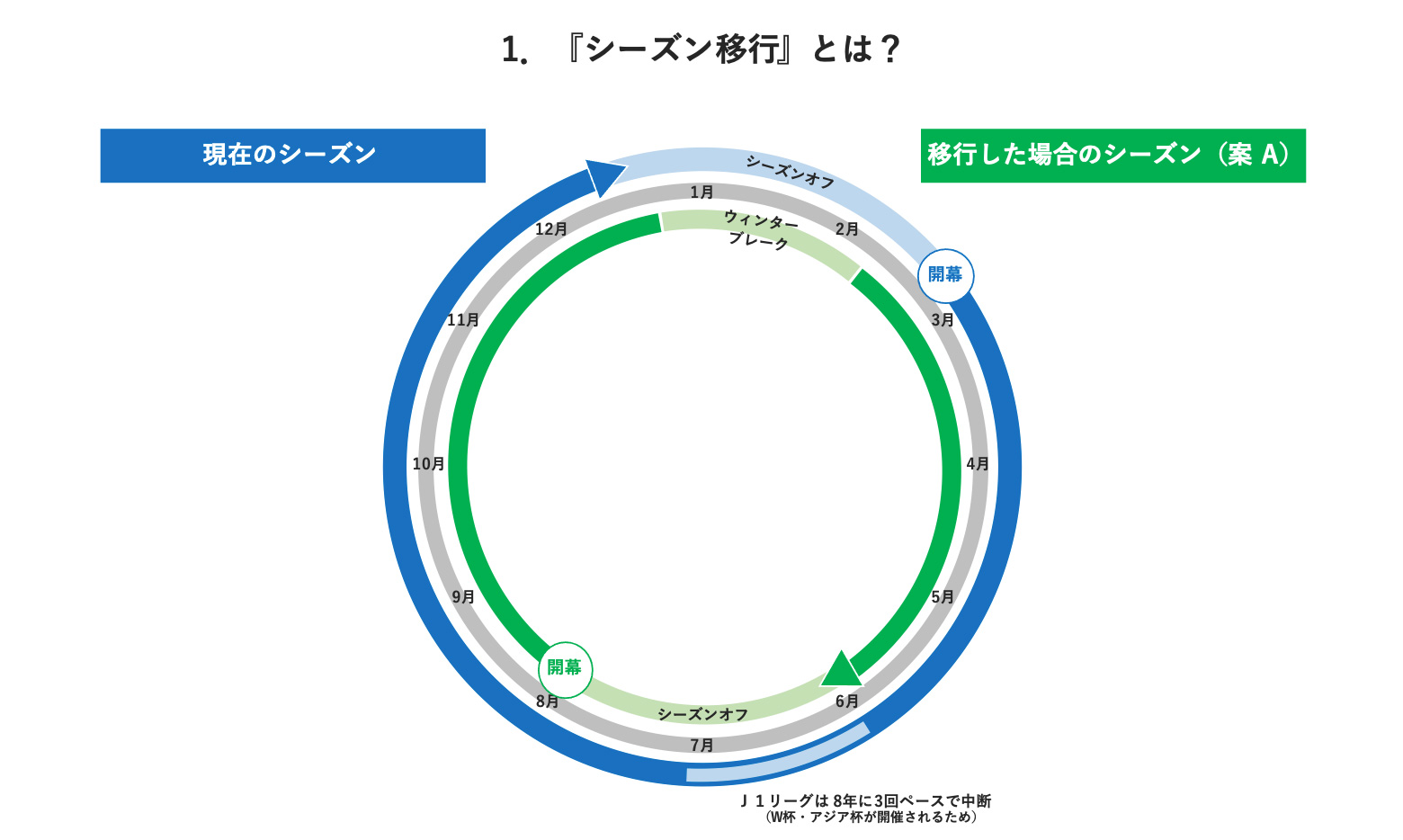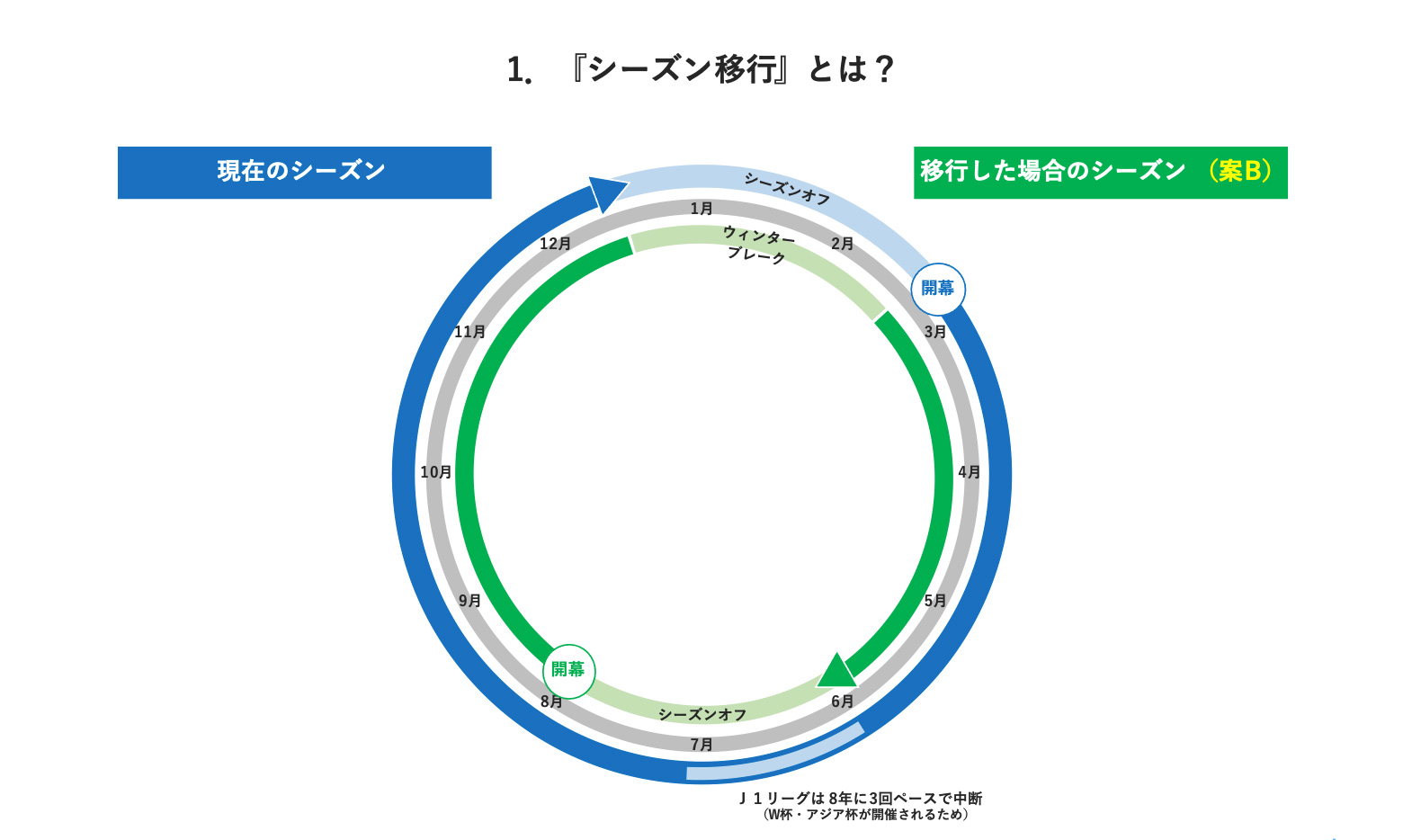 まず、シーズン移行とは何か、です。資料中のグレーの円が1月から12月を表しており、現行のシーズンは、2月後半頃に開幕をして12月の初旬頃に終わるというシーズンになっています。