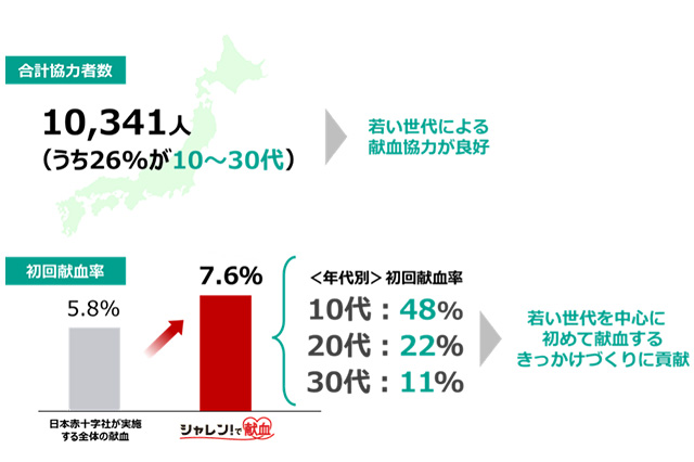 また、「シャレン!で献血」における初回献血率(注5)は、日本赤十字社が実施する令和四年度の初回献血率よりも高く、特に10~30代の数値が良好な結果となり、若い世代の献血者が減少傾向のなか、献血に協力するきっかけづくりに貢献しました。