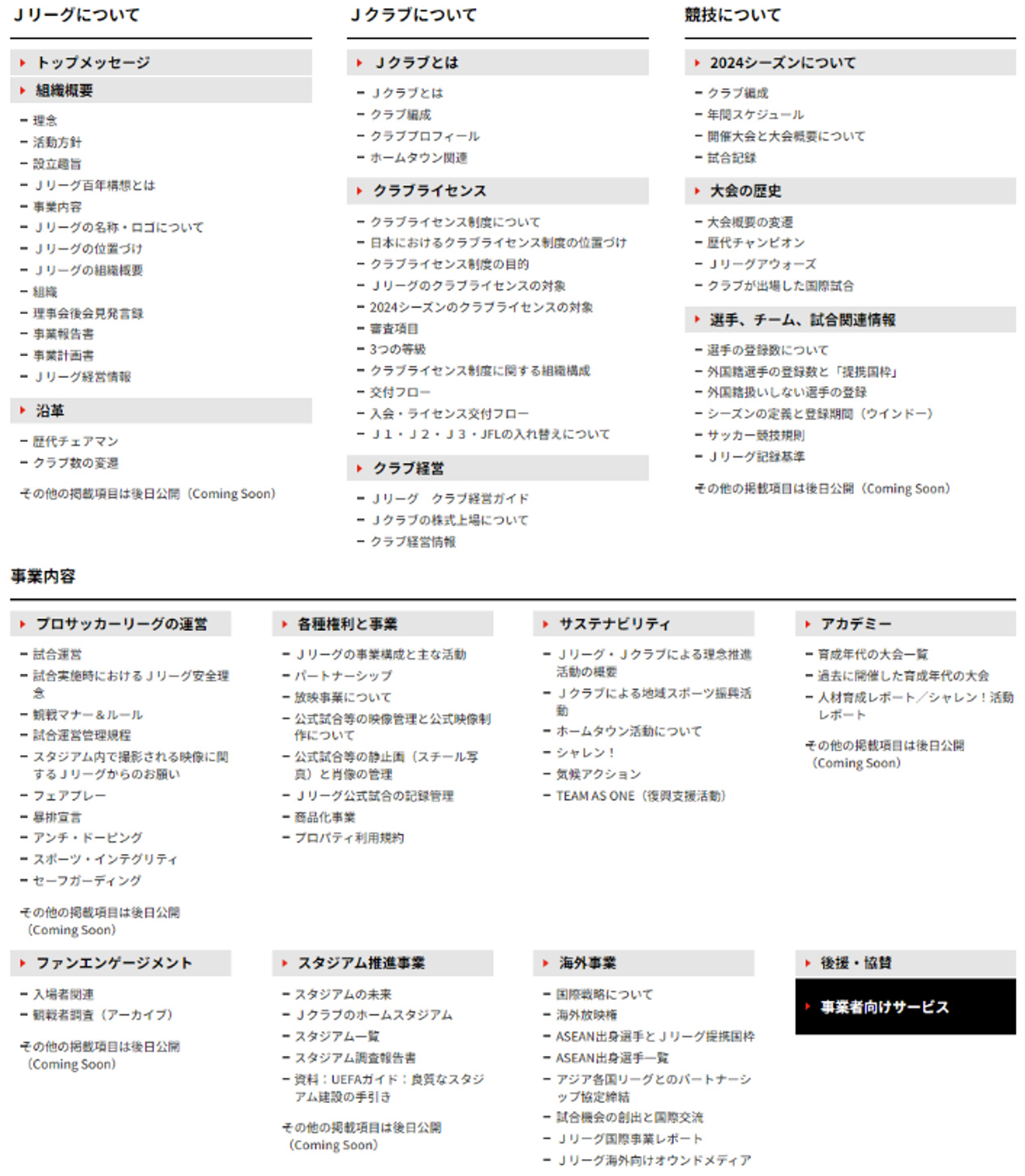 トップメッセージをはじめ、プレスリリース、組織・経営情報やJリーグが取り組む各事業活動などを掲載しておりますので、ぜひご高覧ください。