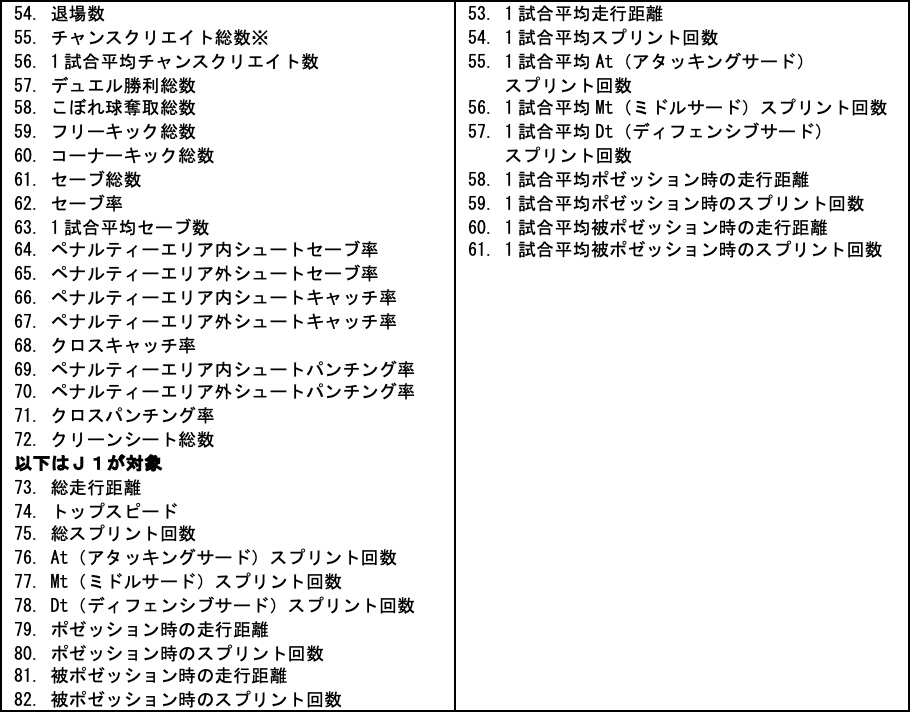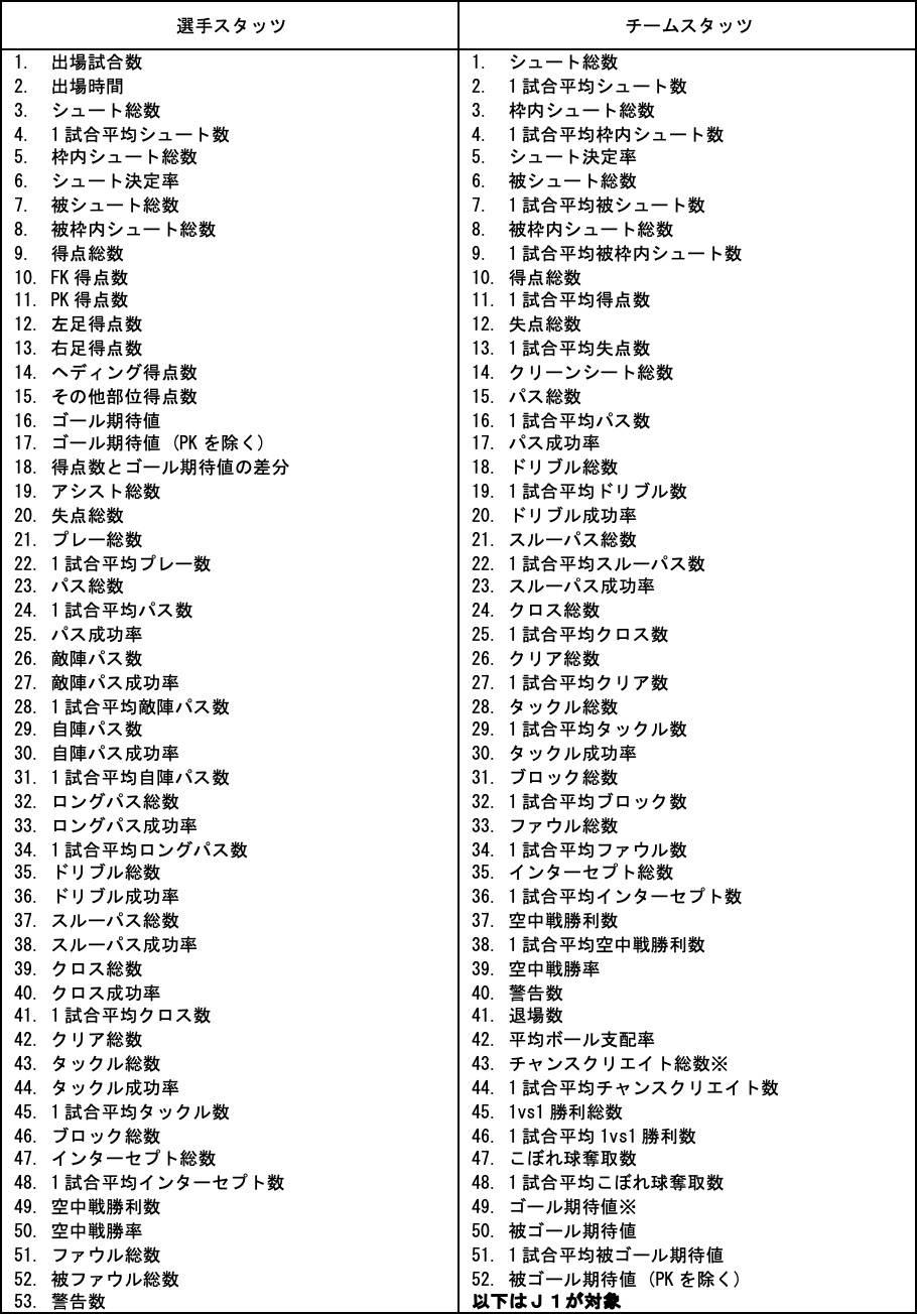 ・新たに追加したデータ項目の一例として「デュエル勝利回数※3」や「エリア別のパス成功率」、「空中戦勝利率」、「こぼれ球奪取総数」など試合中の局面を数値で表したより細かいプロフェッショナル向けのデータ項目のも一部表示対象として追加しています。