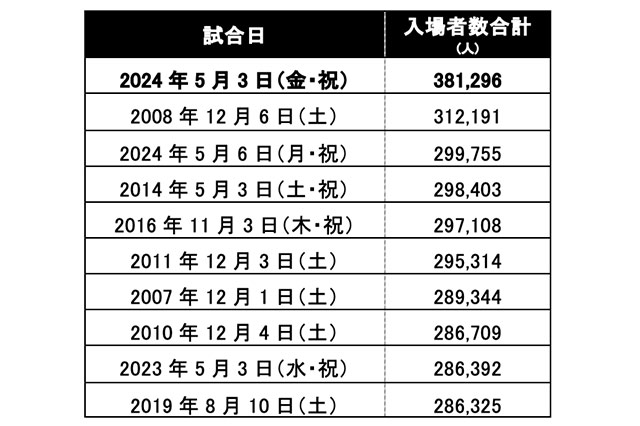 なお、5月6日(月・祝)のリーグ戦合計入場者数も歴代3位となり、ゴールデンウィーク期間中(4月27日(土)~5月6日(月・祝))に開催された試合には、1,002,664人と多くのファン・サポーターの皆さまにご来場いただきました。