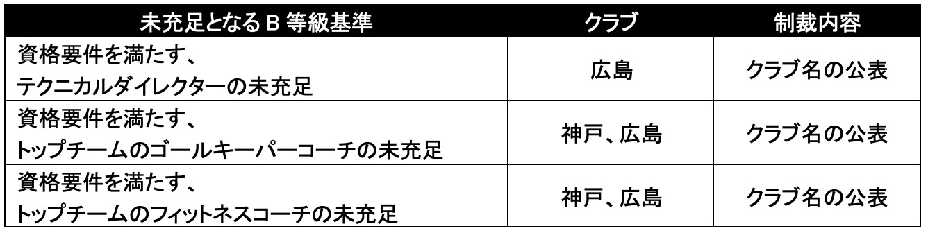 クラブライセンス基準のうち、「B等級」に指定されている基準については、それを充足していなくてもクラブライセンスは交付されます。ただし、J1クラブライセンス交付規則第7条および第8条に基づき、B等級基準をひとつでも充足していないクラブには、ライセンス交付と同時に制裁が科され得ます。