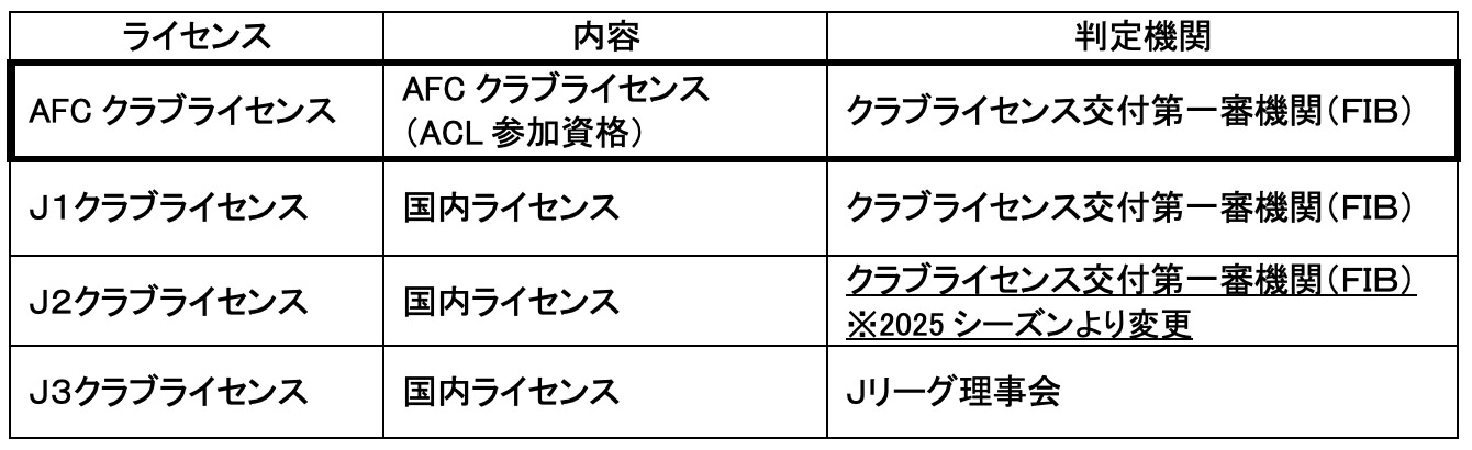 ACLのシーズン移行に伴い、2023/24シーズンに引き続きJ1クラブライセンスとは別に、AFCクラブライセンス判定を実施いたしました。AFCクラブライセンスは、J1クラブライセンスと同様に、クラブから提出された申請書類に基づき、Jリーグから独立した第三者機関であるクラブライセンス交付第一審機関(FIB)にて判定されます。