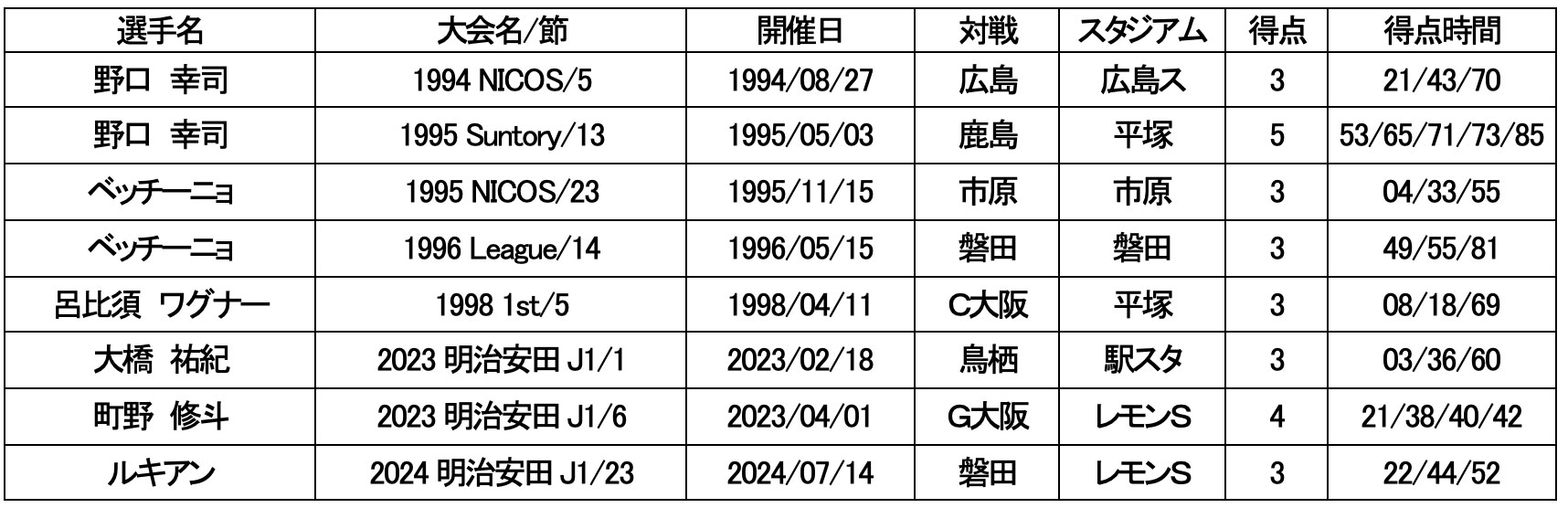 【湘南ベルマーレ J1リーグ戦 ハットトリック一覧】