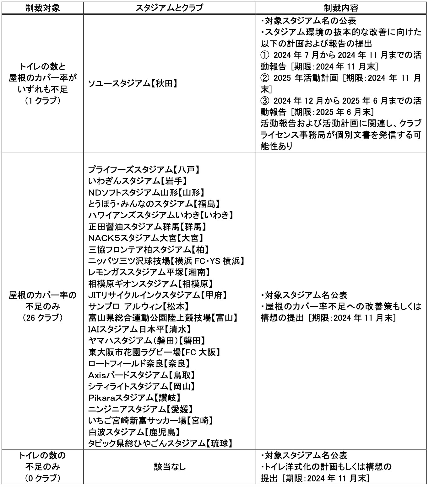 ただし、J1・J2クラブライセンス交付規則第7条および第8条に基づき、B等級基準(特にホームスタジアムのトイレの数・屋根のカバー率)をひとつでも充足していないクラブには、J1・J2クラブライセンス交付と同時に制裁が科され得ます。また、2013年申請[2014シーズン]以降、トイレの数について基準未充足であっても判定の計算根拠となる観客席の数を「満員」から「60%入場」を母数として判定した場合に基準を充足していれば、制裁を免除しています。