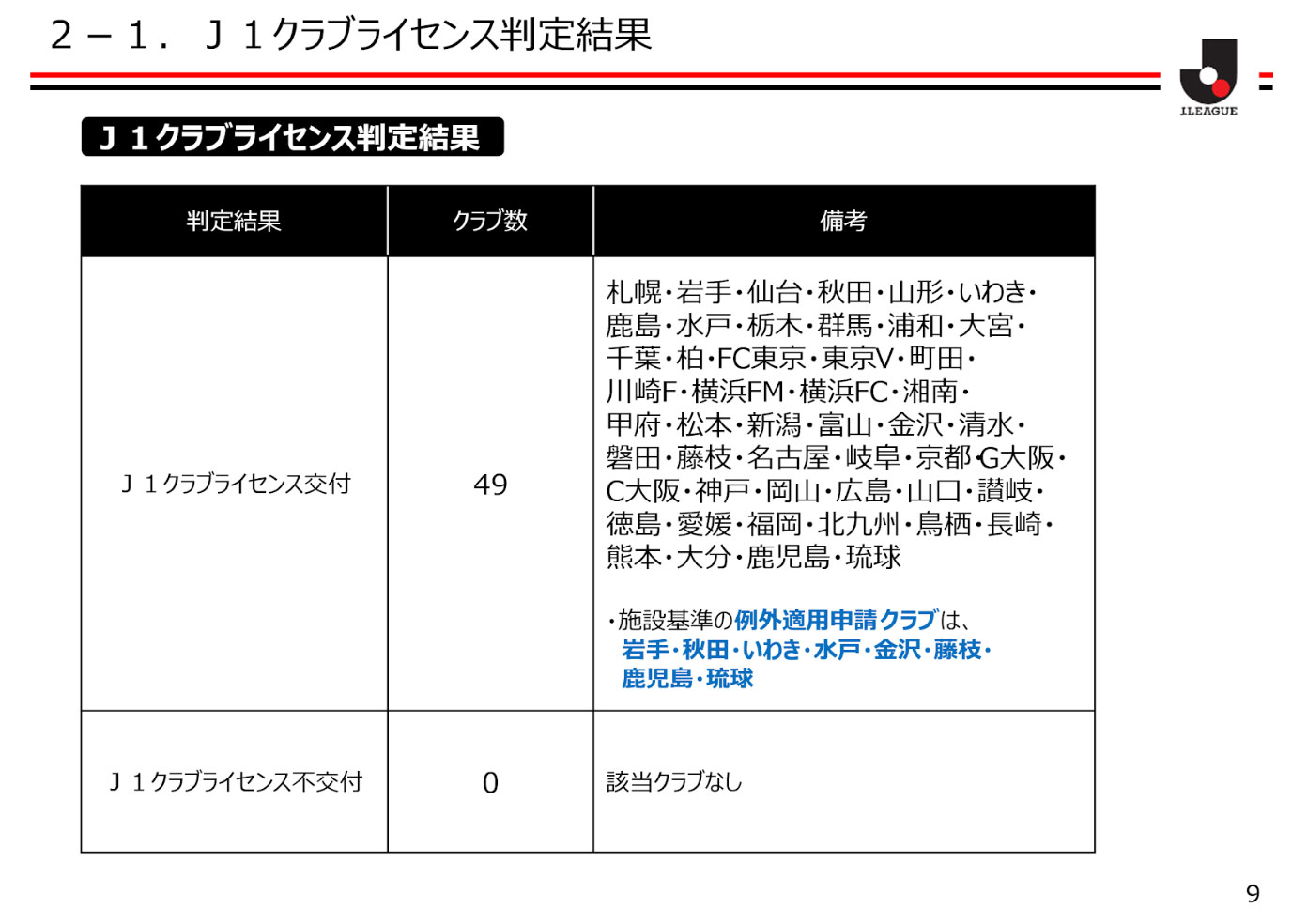 J1クラブライセンス交付 49クラブ。不交付クラブなし。