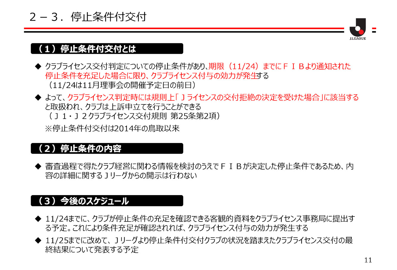 11月25日までに改めて、Jリーグより停止条件付交付クラブの状況を踏まえたクラブライセンス交付の最終結果について公表させていただきます。