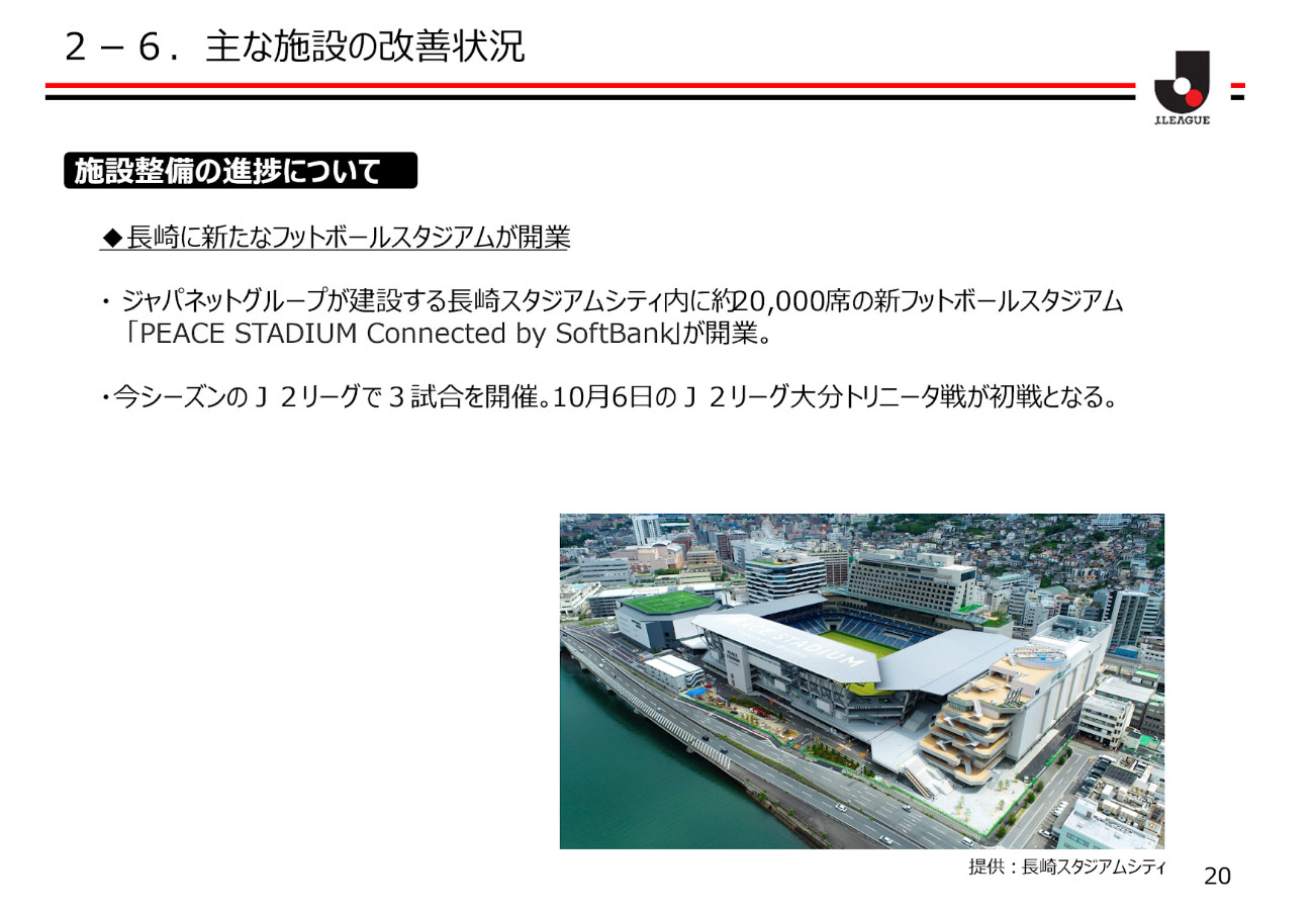 長崎には新たにジャパネットグループが建設する長崎スタジアムシティ内に約20,000席の新フットボールスタジアム「PEACE STADIUM Connected by SoftBank」が開業する予定です。今シーズンの明治安田J2リーグ3試合を開催予定で、10月6日のJ2第34節 大分トリニータ戦が初戦となります。是非メディアの皆さんにも取り上げていただければと思います。