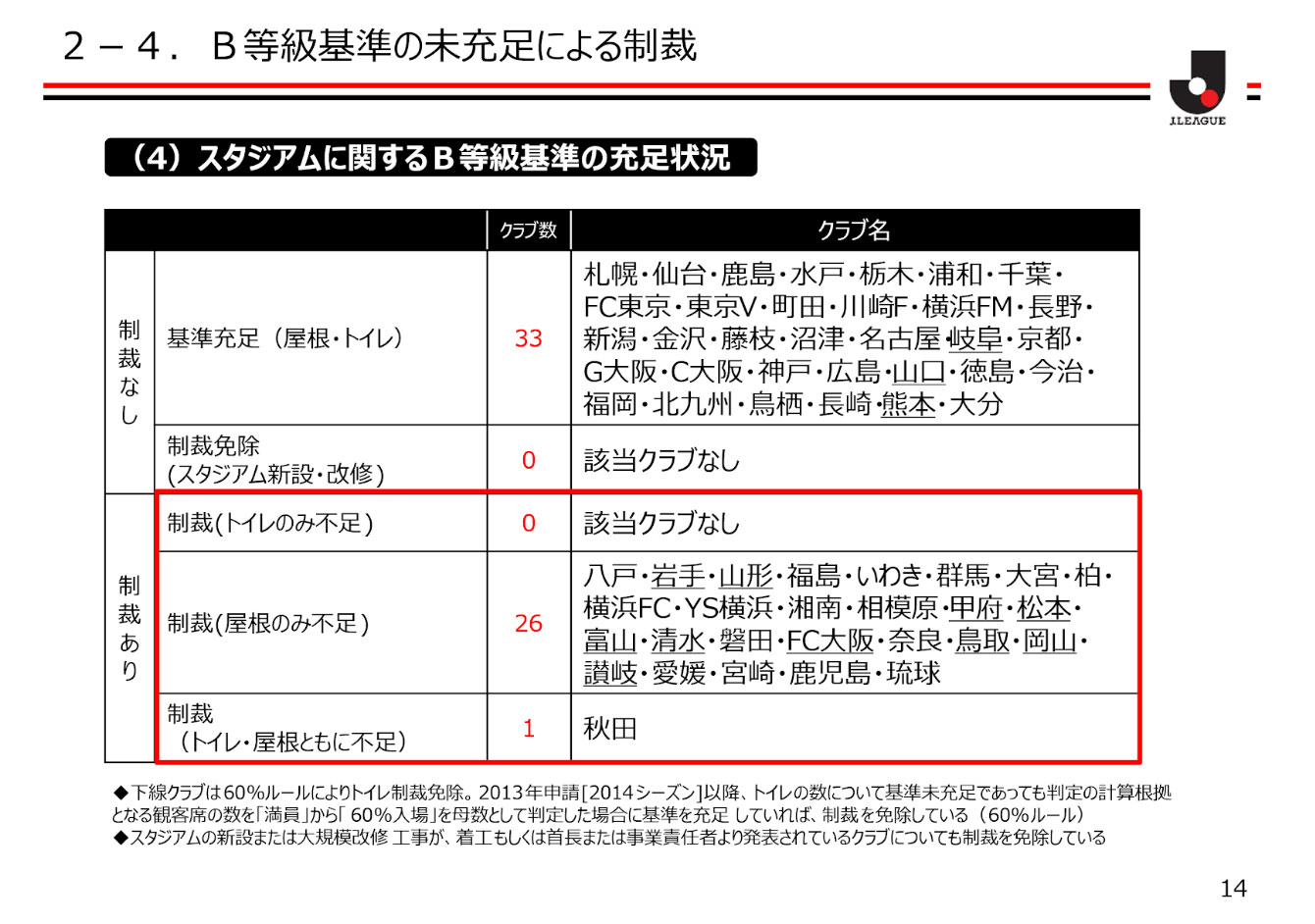 クラブライセンスの基準はA、B、Cの3つの等級に分かれており、B等級は充足していなくてもクラブライセンスは交付されますが、制裁が科され得ることになっています。施設に関しては、スタジアムのトイレと屋根のカバー率に関する基準をB等級として設定しています。