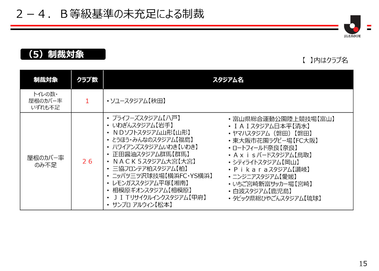 制裁の内容につきましては、トイレ、屋根のカバー率が不足している対象スタジアムの公表、改善計画の提出という形となっています。両方が不足している場合は、抜本的な改善ということで、細かく改善の状況を確認させていただくことになります。