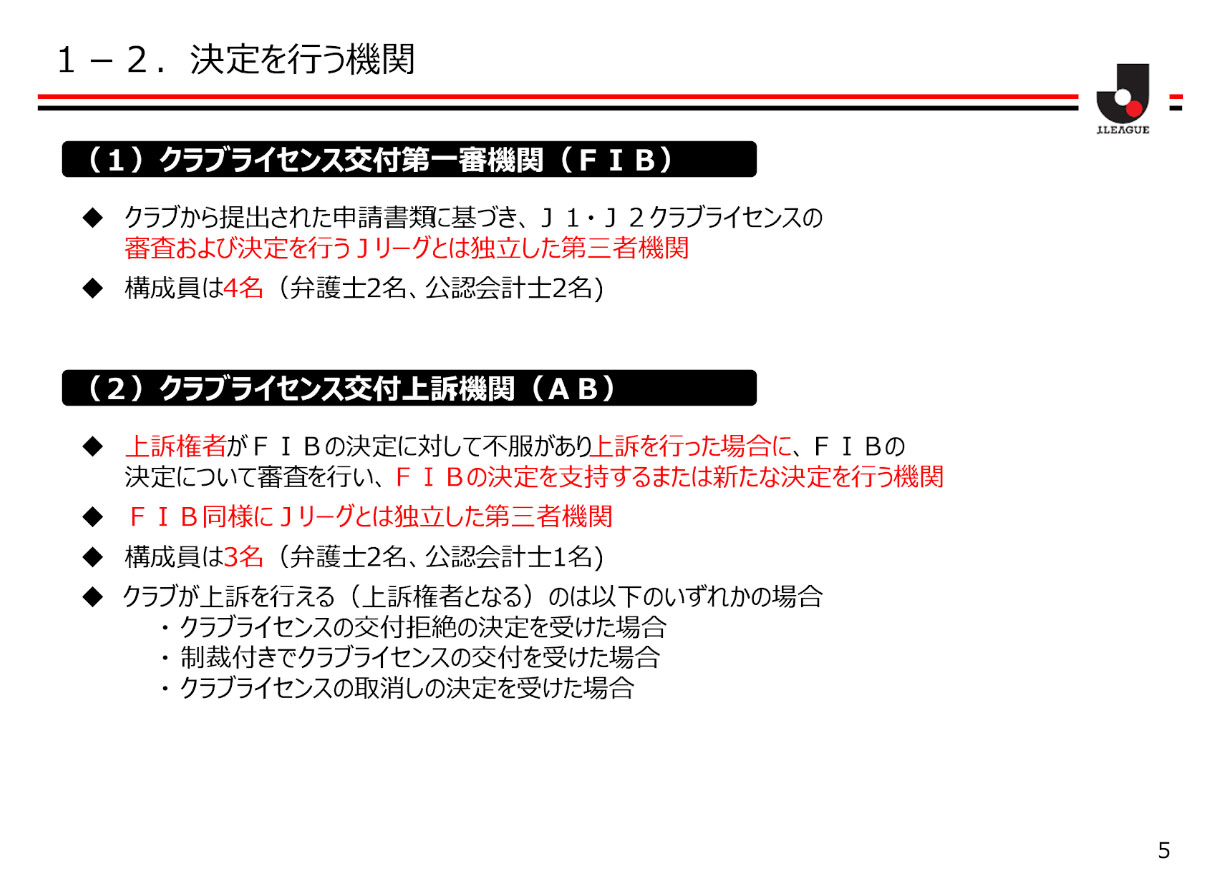 昨年までは、J2クラブライセンスについてはJ3と同じように理事会での判定としていましたが、今シーズンからJ1と同じようにクラブライセンス交付第一審機関(FIB)での判定となります。