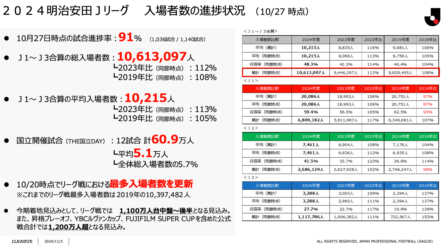 リーグ戦終盤に差し掛かった10月27日(日)時点での試合進捗率は91%、総入場者数は10,613,097人で、2023年比112%、2019年比108%という進捗になっています。