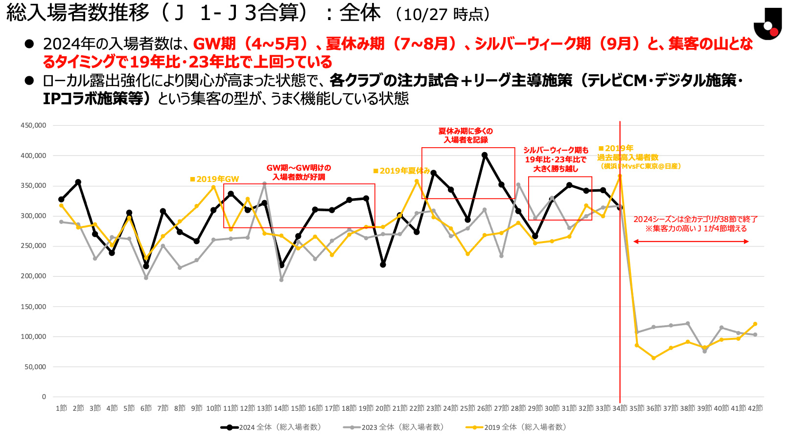 なぜ、この山が作れているかということですが、端的に申し上げますと、この期間にローカル露出強化のプロジェクトを実施し、各地域において露出が増え、関心が高まった状態をここ1、2年で醸成できていたからだと思います。リーグも伴走する形で、各クラブに夏休み時期やゴールデンウィーク時期に注力試合を設定してもらい、その注力試合で高まった関心を取り込むといった集客の型が、各地域の中で出来つつあると思います。これらがうまく機能していることが、こういった夏休み期などで大きく数値を積み上げられている要因だと思っています。
