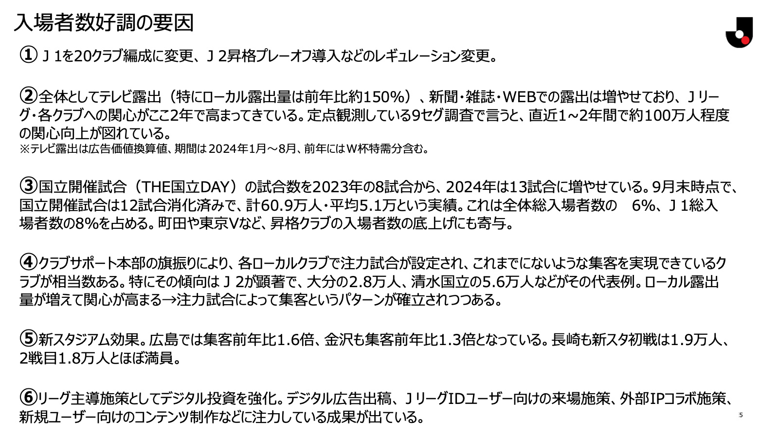 5点目は、新スタジアムの効果です。サンフレッチェ広島は、新スタジアムの効果もあり、集客の前年比が1.6倍、ツエーゲン金沢も集客が前年比1.3倍、V・ファーレン長崎は、新スタジアムでまだ2試合しかゲームを開催していませんが、初戦1.9万人、2戦目1.8万人と、ほぼ満員の状態となっています。おそらく来シーズンにかけても、こうした新スタジアム効果は継続するのではないかと捉えています。