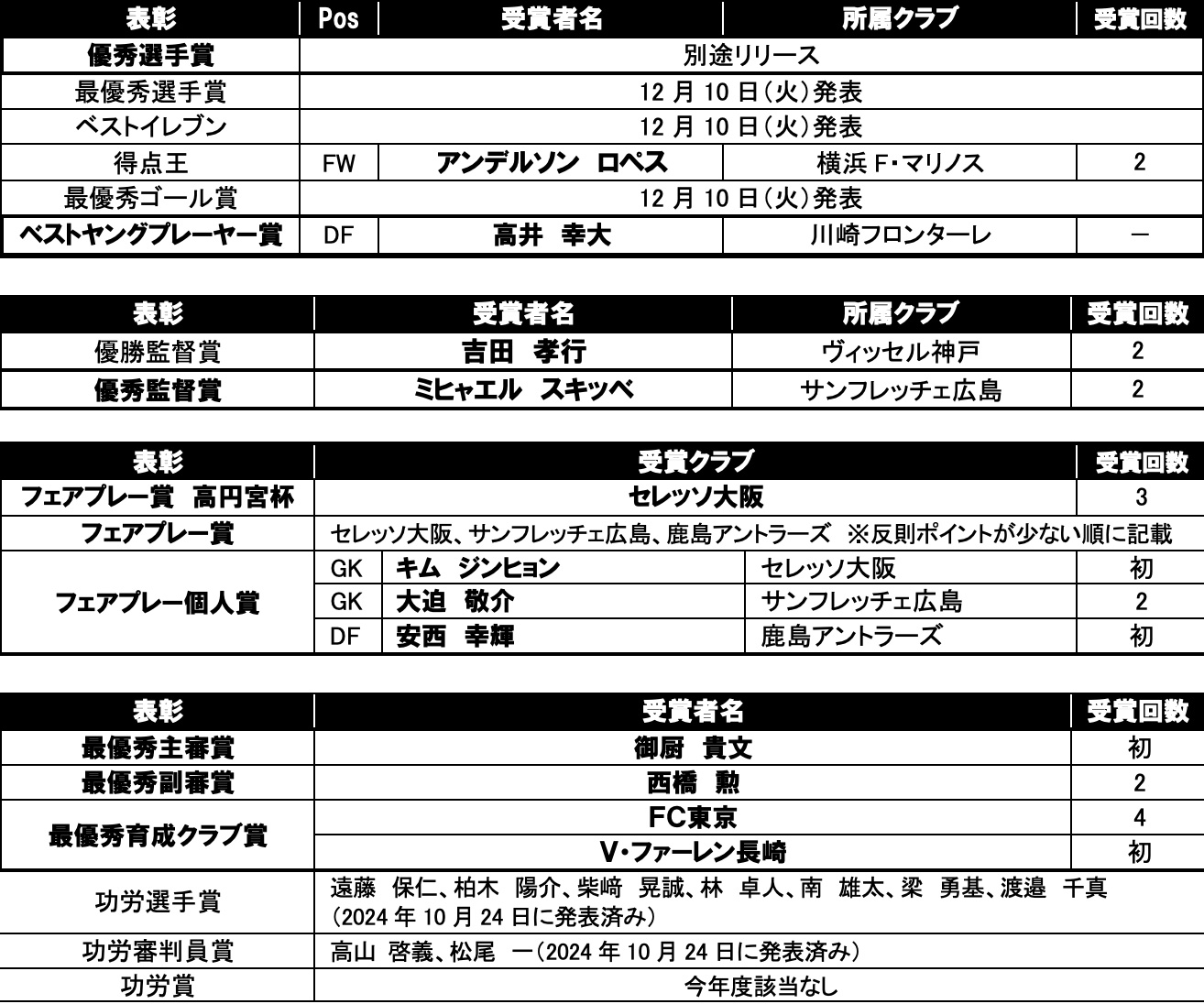 【2024Jリーグ 各賞受賞者】太枠内=本日発表