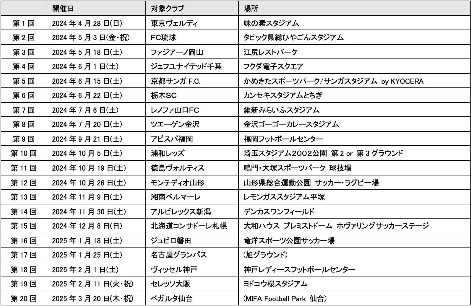 2025年度は、4月20日(日)ロアッソ熊本(熊本県民総合運動公園 補助競技場)を皮切りに、全15回を開催。今後はJリーグ60クラブの拠点を優先的に47都道府県での開催を予定しております。