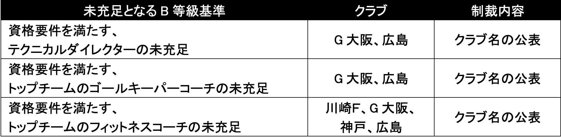 クラブライセンス基準のうち、「B等級」に指定されている基準については、それを充足していなくてもクラブライセンスは交付されます。ただし、J1クラブライセンス交付規則第7条および第8条に基づき、B等級基準をひとつでも充足していないクラブには、ライセンス交付と同時に制裁が科され得ます。