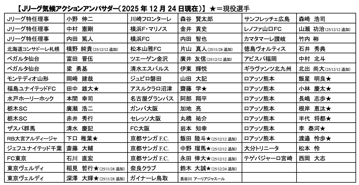 ※最新のJリーグ気候アクションアンバサダー一覧はこちらからご確認ください
