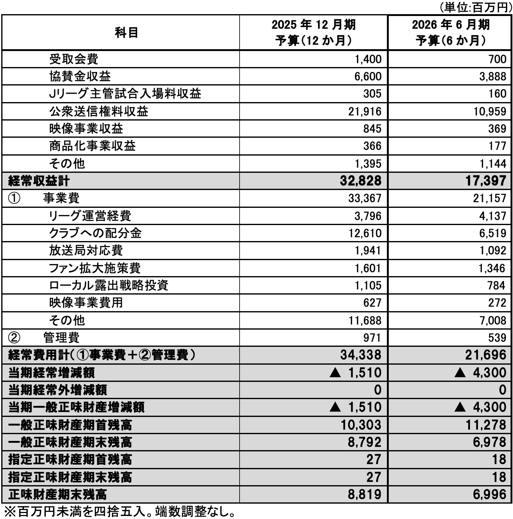 2025年12月15日(月) 15:15 2026年6月期予算について Jリーグニュース Tweet 2026年6月期予算について Jリーグは本日開催した社員総会で、翌事業年度(2026年6月期)の予算を承認しました。なお、シーズン移行に伴う決算期変更の為、翌事業年度は6か月の変則決算となっております。 ■2026年6月期予算 コメントをする 一覧へ Tweet