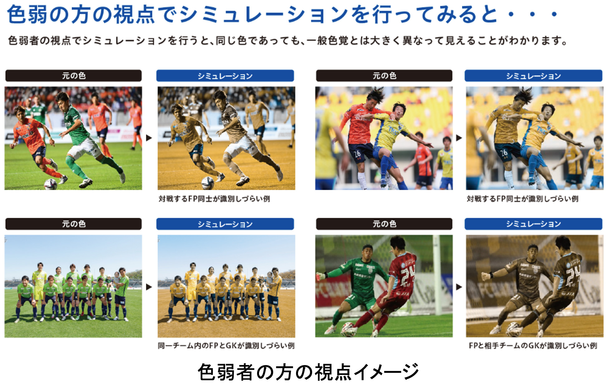 サッカーにおいて、ユニフォームカラーの組み合わせは重要な要素であり、適切なユニフォームカラーの組み合わせは試合に関わるすべての人にとって、良い影響をもたらします。一方で、水色と白など、類似した色の組み合わせの場合は、試合環境(天候や照明など)によって識別がしづらい場合があります。また、日本全体で約320万人(※)いる色の区別がつきづらい色弱者の方への配慮や、色覚の多様性に対応するカラーユニバーサルデザインの観点でも、適切な組み合わせを選択する必要があります。各クラブとも協力の上、すべての人にとってより見やすい試合環境を構築することを目指し、本ツールを試験導入することとなりました。今シーズンから本ツールを元に対戦カードごとの組み合わせを設定し、各クラブの確認を経て組み合わせを決定します。