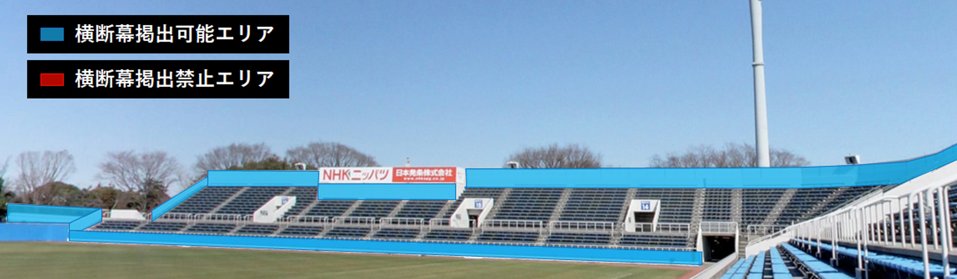 ・掲出可能エリア内でも、スタジアムの案内看板・スポンサー看板等を隠す掲出は禁止です