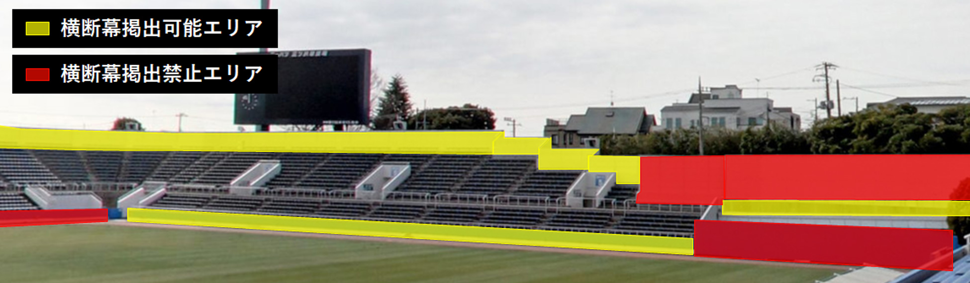・掲出可能エリア内でも、スタジアムの案内看板・スポンサー看板等を隠す掲出は禁止です
