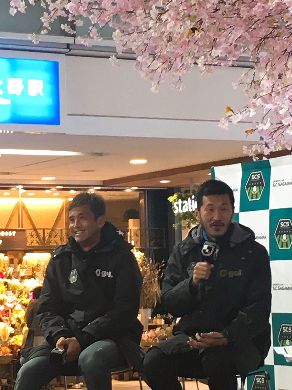 ホームでの開幕戦を明日に控えた相模原は9日、相模大野駅前でトークショーイベントを開催。今季加入組の稲本 潤一と富澤 清太郎が出席し、喋りで会場を盛り上げた。