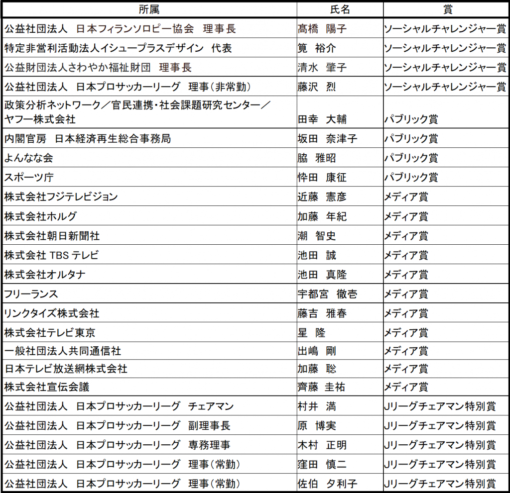 ●各賞:ソーシャルチャレンジャー賞/パブリック賞/メディア賞/Jリーグチェアマン特別賞