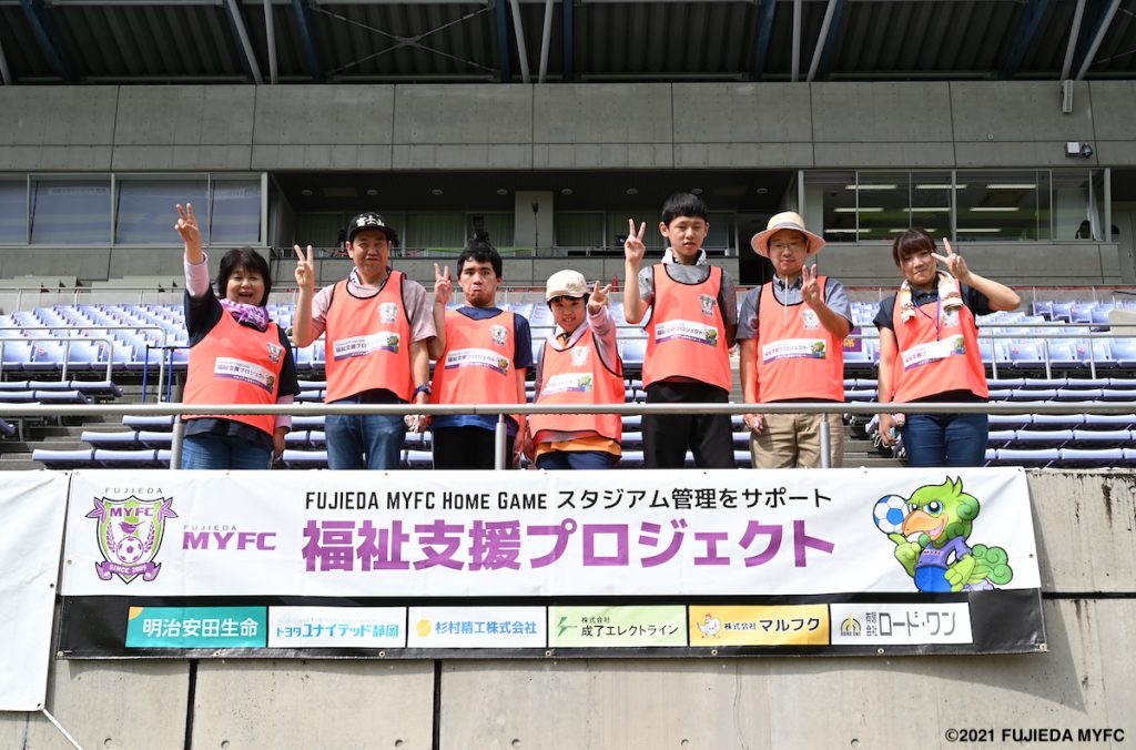 藤枝MYFCがホームタウン内の障がい者就労継続支援事業所・企画に賛同いただいたパートナー企業と共に、プロスポーツの現場を通じてあらゆる人が社会で活躍できる環境を作り上げる取り組みです。試合運営に関連した業務体験を通じて参加者の能動的な労働・就労意欲を喚起し、社会との交流を増やすことで社会参加の増進を積極的に支援します。同時に事業所の存在を周知することで、事業所利用者が自立した日常生活を送ることができる社会の構築の手助けにつながります。