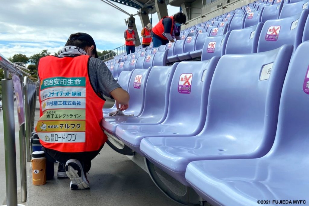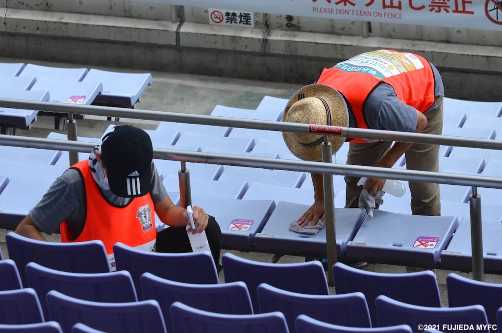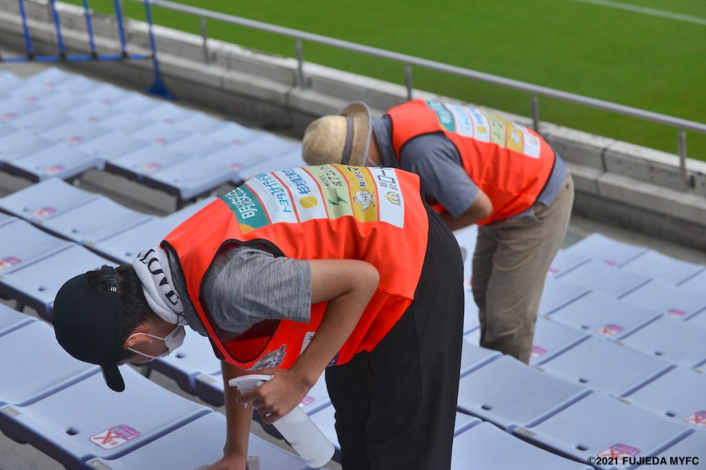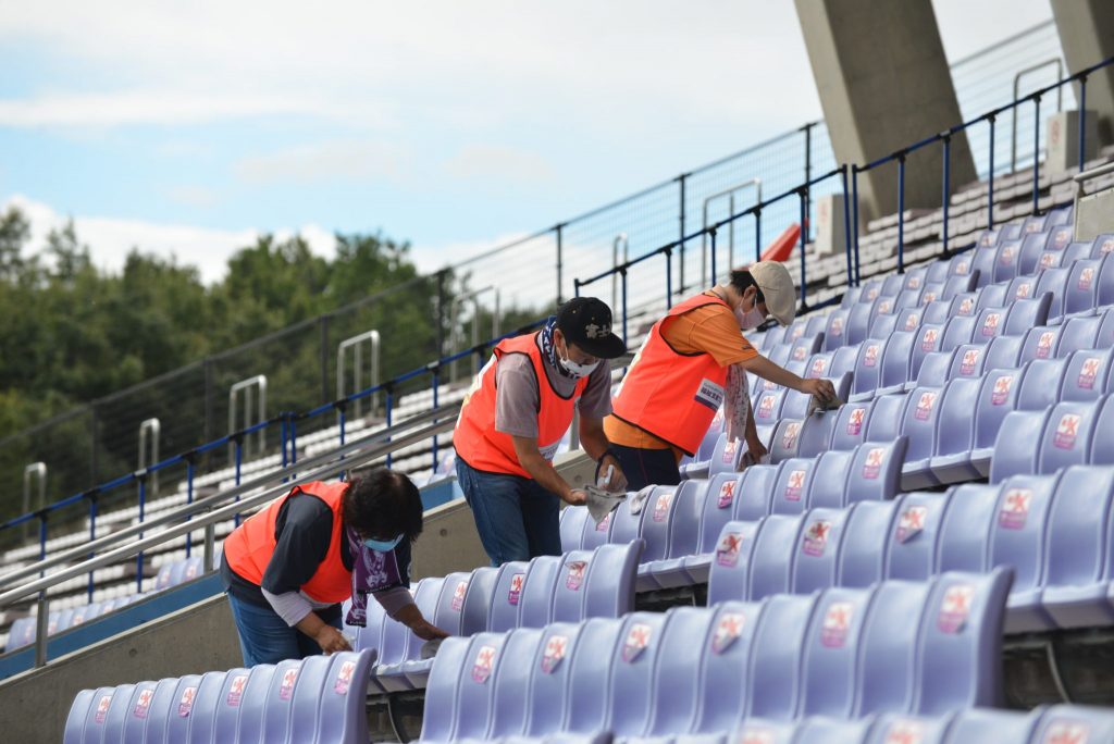 この日の活動内容はスタンドの座席拭きと消毒です。新型コロナウイルス感染拡大防止のため、5,000席ある座席を清掃・消毒いただきました。
