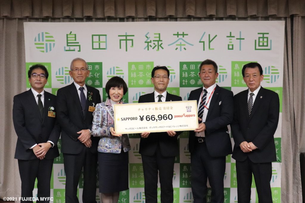 11月10日(水)、藤枝MYFCの鎌田昌治会長がサッポロビール株式会社様・ポッカサッポロフード&ビバレッジ株式会社様と染谷絹代島田市長を表敬訪問し、寄附金を贈呈しました。