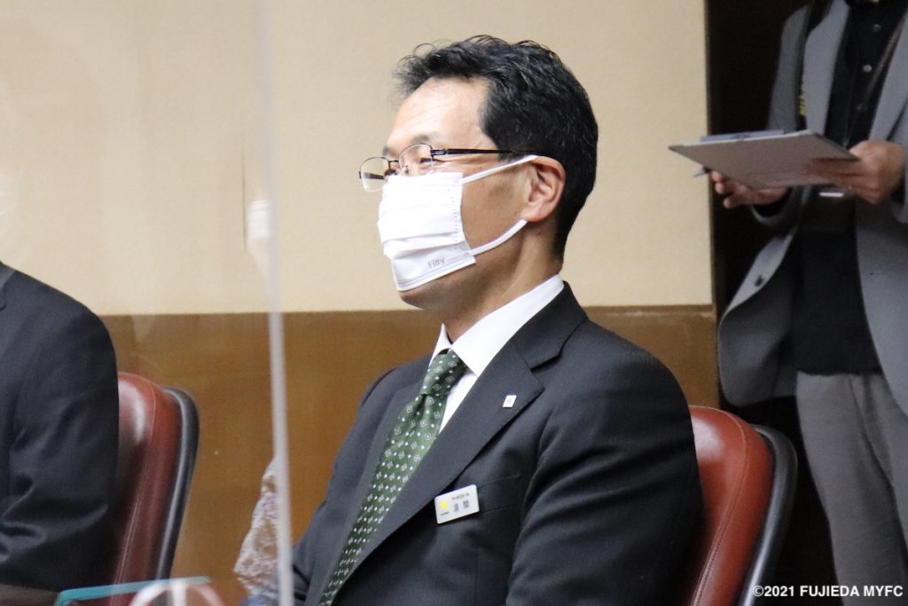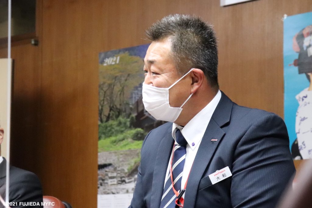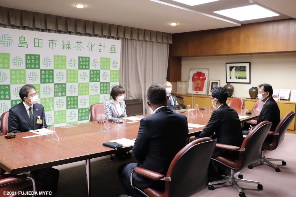 「ホームタウン焼津市に工場があるご縁で長く藤枝MYFCのスポンサーをさせていただいております。この度はお隣の島田市にお役立ていただければと参りました」とご挨拶いただきました。
