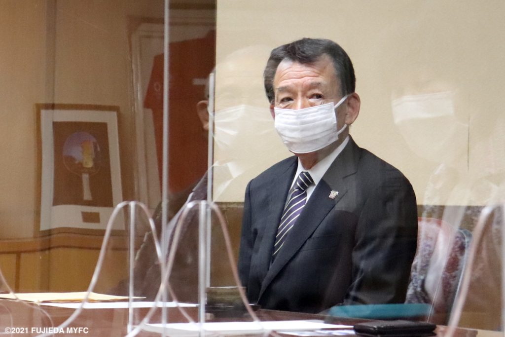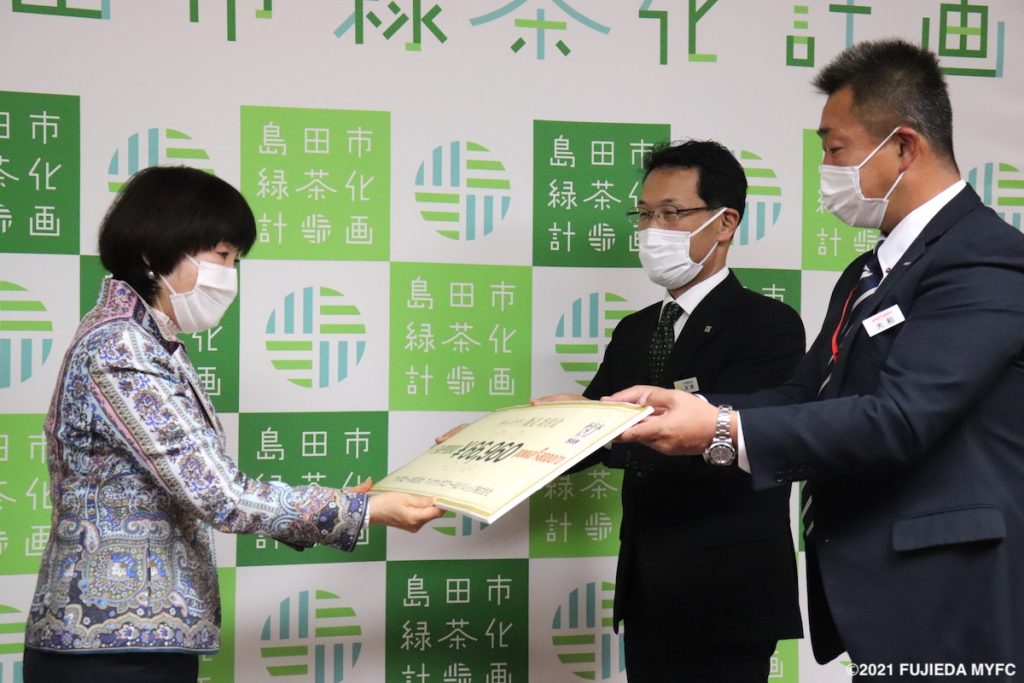 「貴重な浄財をこうして賜りまして、心より感謝申し上げます。志まで併せて頂戴したということで感動いたしました。藤枝MYFCさんはスポーツで地域を元気に!とすごく頑張っていただきまして、先般は島田DAYも作っていただき私はキックインもさせていただきました。スポーツの力というのはスタジアムに行って初めて伝わる感動があります。地域の気持ちを一つにするという大きな力を持っていますので、これからもしっかりと応援していきたいと思います。」