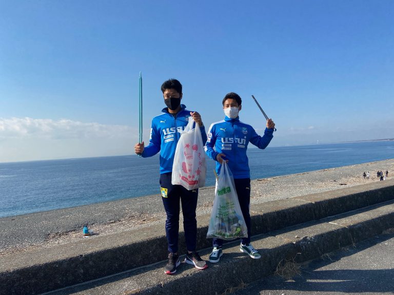 12月22日に開催された「ホワイトウィングス ビーチクリーンPROJECT in千本浜」に背番号14番徳永晃太郎選手、背番号38番濱託巳選手が参加いたしました。