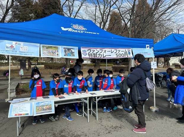ヴァンフォーレファームでスクール生たちが生産したお米と野菜で作ったレトルトカレーをスポンサーである白州杜苑がパック化し、スクール生たちが開幕戦(2月25日(土)徳島戦)のブースで販売しました。