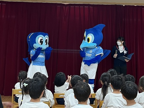 5月25日(木)、中泉保育園にて開催されたチャイルドシート着用推進モデル園認定式にジュビロくん・ジュビィちゃんが参加しました。