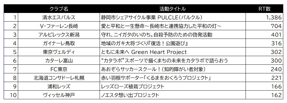 選考に先立ち、ファン・サポーターの皆さまが”魅力的、応援したい”と感じた活動に投票をしていただく「一般投票(Twitter)」を実施しました。多くのみなさまより投票いただき、誠にありがとうございました。上位10クラブを発表いたします。