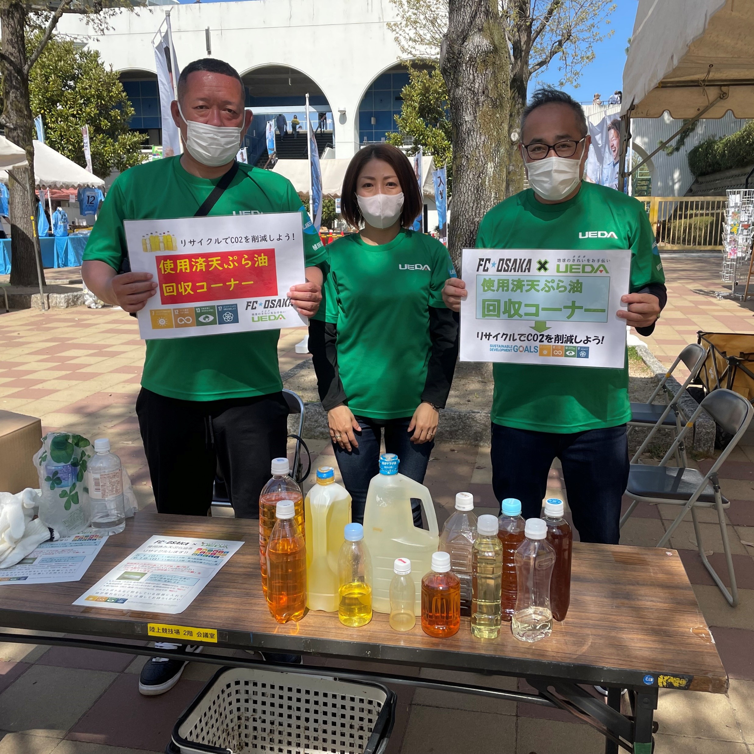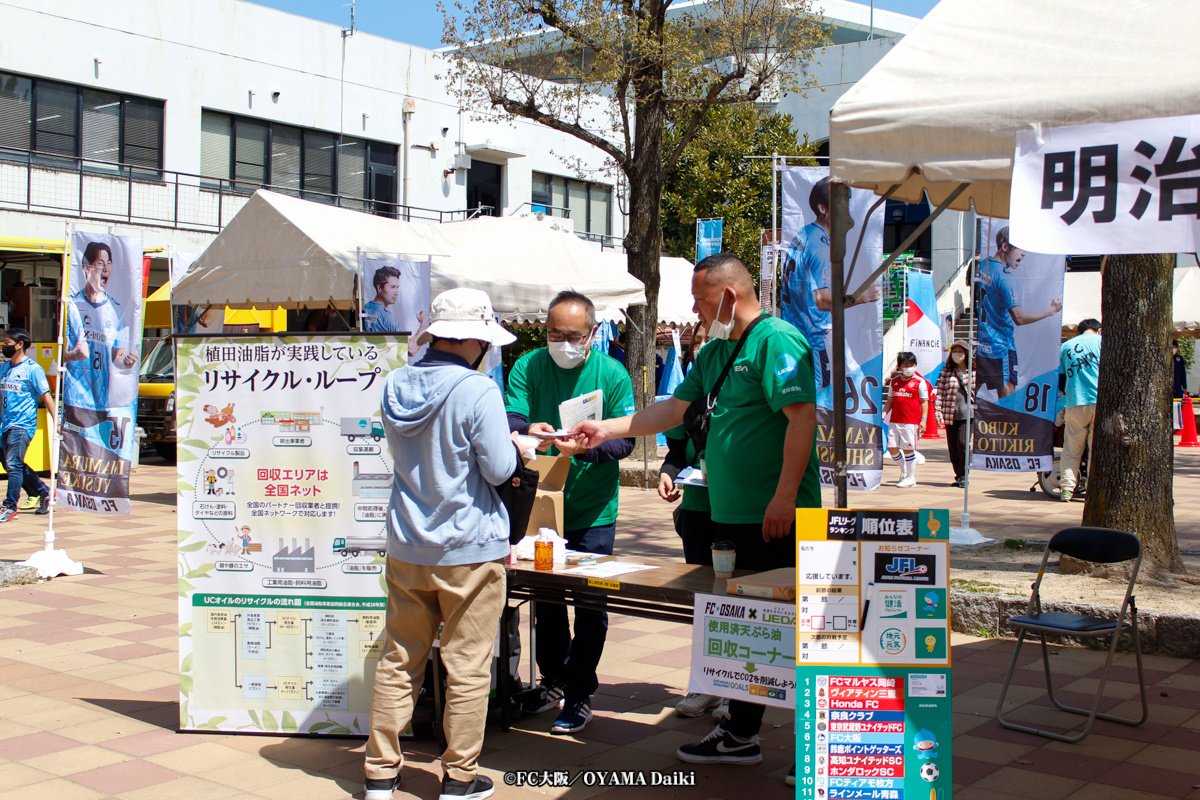 また年間を通じて、パートナー企業である植田油脂株式会社の協力の下、ホームゲーム開催時に家庭で出た廃食油の回収を実施。回数を重ねるごとに廃食油を持って会場を訪れるサポーターが増え、クラブ、パートナー企業、そしてサポーターが三者一体となって循環型社会への一歩を踏み出すことができました。将来的にはリサイクル燃料としての遠征などの移動に活用することを目標とし、サポーターと共に進めた循環型社会への取組みがクラブを支えていると実感できる活動とすることを目標としています。