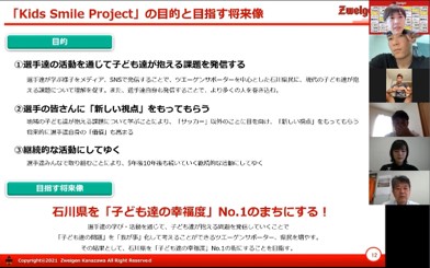 石川県を「笑顔が溢れる街にすること」、それはつまり、この街の子どもたちを笑顔にし続けること。「子どもたちにお腹いっぱいご飯を食べてほしい」という一人の選手の想いが、チームに広がり、街に広がり、2021年7月に「Kids Smile Project」として立ち上がった。それから毎月、全選手とクラブスタッフ、そして「子どもたちが抱える課題」に詳しい専門の方に講師を務めていただき勉強会を実施している。その結果、選手が子どもたちに何ができるかを自発的に考え、実際に活動を始めてくれるまでになった。