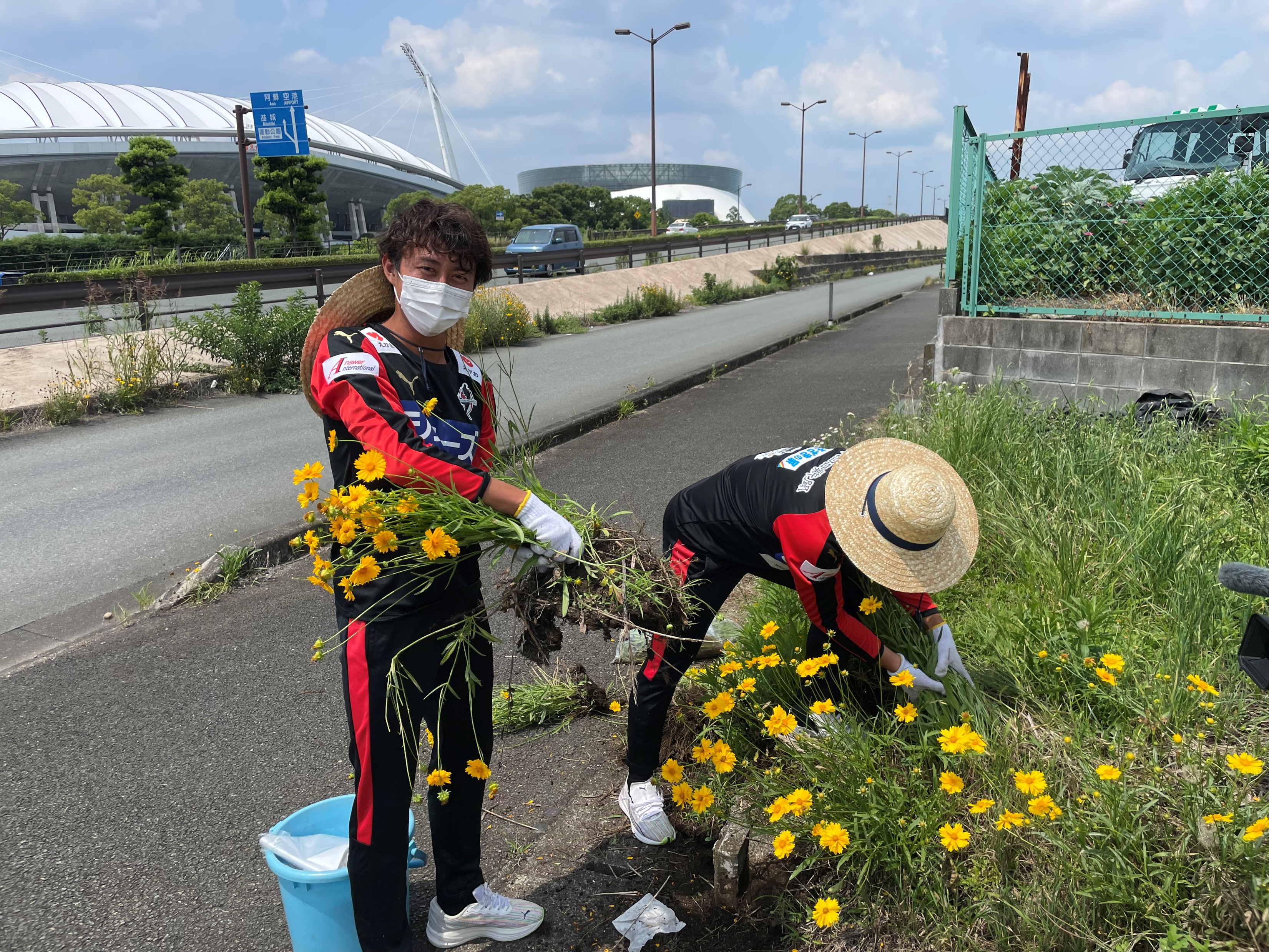 MISSION1では、環境省九州地方環境事務所も駆除のために様々な広報活動を行っている特定外来生物「オオキンケイギク」の駆除をスタジアム周辺にて行い、周辺住民の方へも駆除の依頼や方法を伝えました。また地元TVでも取り上げられ、「オオキンケイギク」の存在を大きく発信することができました。
