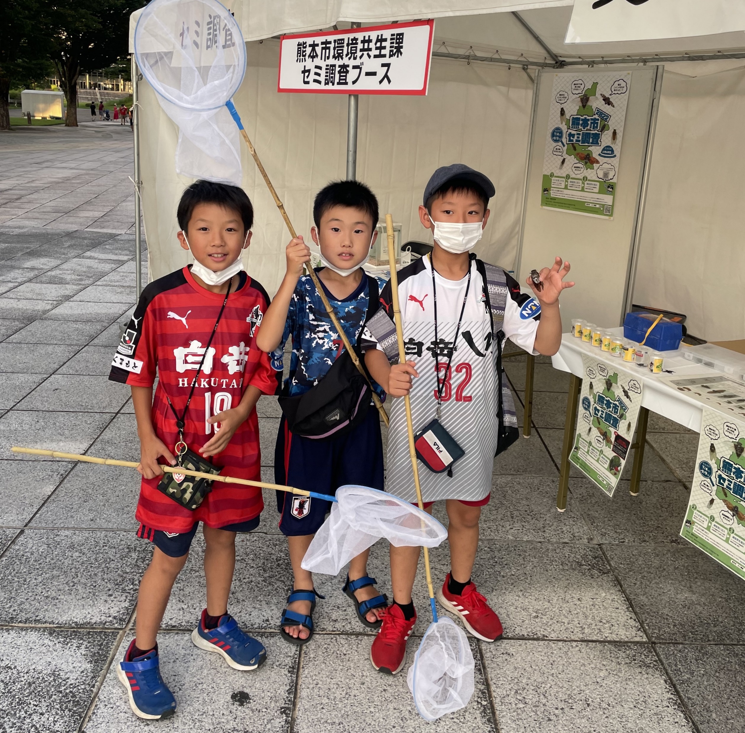 熊本市の豊かな自然環境の保全と持続可能な利用に向けた基本的かつ総合的な計画として「熊本市生物多様性戦略~いきもん つながる くまもと Cプラン~」が平成28年に策定され、熊本市を中心に様々な取り組みがなされています。その一環として令和元年より、自然環境に関する情報収集、整理把握することを目的として行われている「市民参加型セミ調査」というものがあります。昨年、熊本県の地元新聞「熊本日日新聞」の記事でこの調査のことを見た瞬間に、運命的な出会いを感じたホームタウン担当者はすぐに熊本市環境共生課に連絡し、担当の北村さんとクラブマスコットのロアッソくん、当時のクラブアンバサダー・片山奨典氏と一緒に現場に赴き、指導を受けながら、調査を行いました。