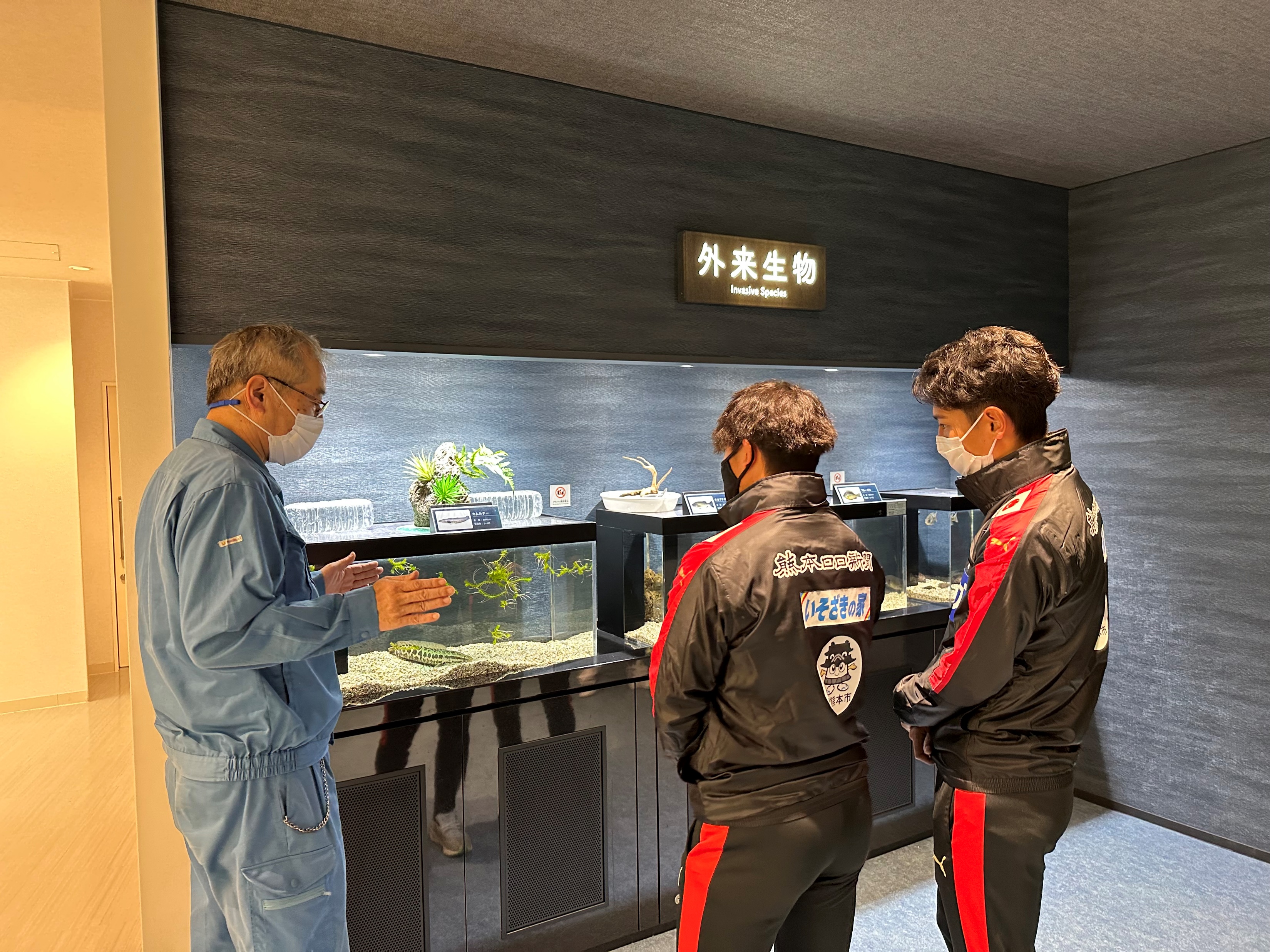MISSION3では、熊本市の湖「江津湖」の外来生物の状況を熊本市動植物園に学びに行き、その後のフィールドワークでは、ブラックバスやカムルチーなどの外来生物を釣った際の回収ボックスを見学、また実際に釣り竿をもって、外来魚の駆除にチャレンジしました。残念ながら駆除ミッションは失敗に終わりましたが、外来魚についての発信というミッションは達成できたことと思います。