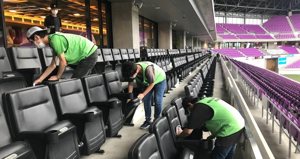 2つ目の“協働”は亀岡市内の就労支援施設と協力し、障がいのある方が生きがいや働きがいを持ち、自分らしく暮らしていくことのできる「共生」社会を目指すため、障がいのある方の就労体験としてホームゲーム開始前の座席清掃や配布物準備、サンプリングの実施などの運営業務に携わっていただきました。