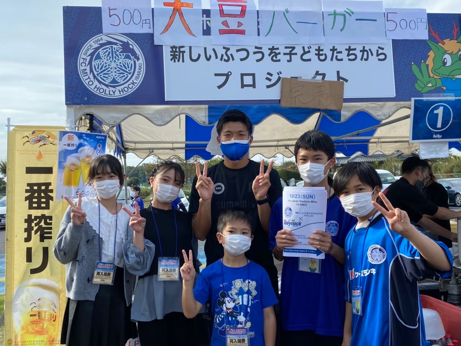 小学生2人をリーダーにした地球の環境を守るためのプロジェクトです。Jリーグ全58クラブに環境保全活動に関するアンケート調査を行った茨城県内在住の小学校6年生をプロジェクトリーダーに置き、その小学生が地球環境保全のため、地域の方々と水戸ホーリーホックと協働して大豆ミートバーガーを10月23日(日)のJ2リーグ最終戦ホームゲームにて販売し、地域の方々に対し環境保全への意識付けを働きかけたプロジェクトです。